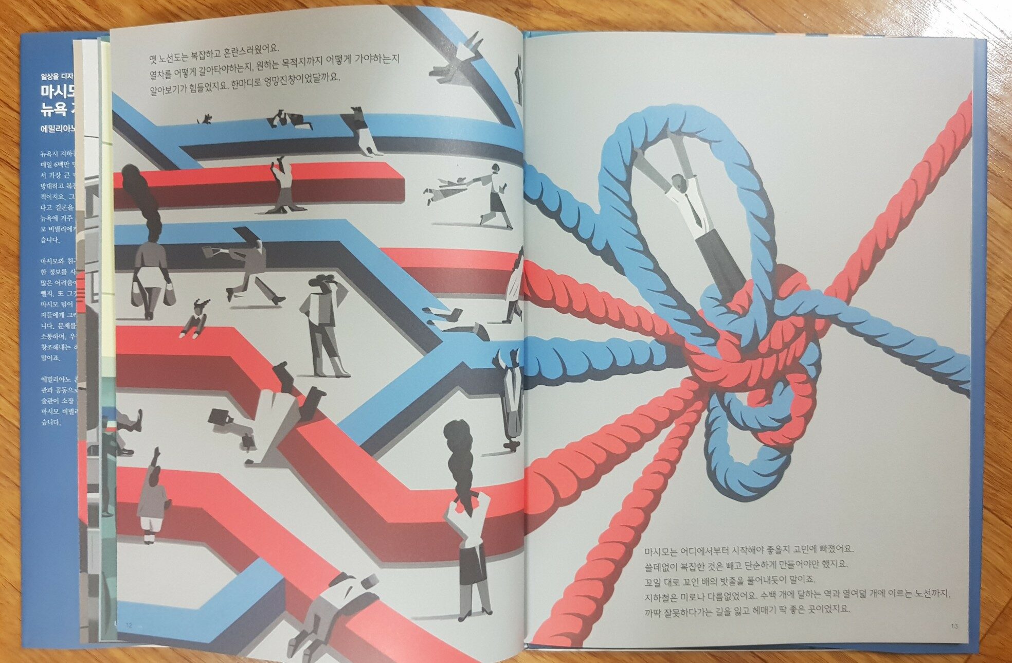 일상을 디자인하는 그래픽 디자인의 거장 마시모 비녤리의 뉴욕 지하철 노선도 멋진 그림책을 만났다. 미리 그림책에 대한 설명없이 그냥 책을 펼쳐보고는 감탄을 했다. 마치 미술관에 와서 그림 감상을 하는것 같았다. 우리 딸이 보기 전에 엄마가 먼저 읽어 본다. 그림책에 대한 사전 지식이 필요한다. 와우~~ 작품이다. 이 책은 우선 마시모 비녤리를 소개하고 있다. 마시모 비녤리는 디자이너였다 마시모는 디자인 중에서도 그래팩 디자인 전문가였다. 그래팩 디자이너들은 책과 잡지 도표와 표지판 기업 로고 등을 만들어 낸다. 감각적인 디자인들이 눈에 들어 온다. 베네* 기업 로고도 보인다. 그의 작품이구나~~ 마시모는 최고라는 뜻의 라틴어 막시무스에서 이름을 따왔다. 마시모는 이탈리아 밀라노에서 태어나서 1965년 뉴욕으로 건너와 디자인회사를 차렸다. 마시모와 친구들의 다지인은 그림에서도 알 수 있듯 복잡함을 덜어내고 가장 단순한 형태를 부각시켰다. 미니멀리즘. 시대를 앞서가는 도전. 뉴욕시의 새 지하철 노선 디자인을 부탁 받은 미사모는 고민에 빠졌다. 미로와 같은 지하철 노선을 단순하게 만들고 싶었던 미사모. 모든 정보를 수집하고 힘든 작업 과정을 거쳐 미사모의 손에 탄생한 다자인. 과연 어떤 디자인일까? 책은 미사모의 일대기를 알려주고 특히 디자인에 대한 그의 단순하지만 남들과 다른 탁월한 생각을 알려주는데 초점을 맞춘다. 글과 그림의 에밀리아노 폰지는 현지 뉴욕 현대미술관 소장의 오리지널 지하철 노선과 마시모의 디자인 작품과 설명을 책에 수록하였다 그래서 책을 읽는 동안 뉴욕 미술관에 관람하는 느낌이었다. *출판사에서 제공하는 책을 읽고 작성한 리뷰입니다
