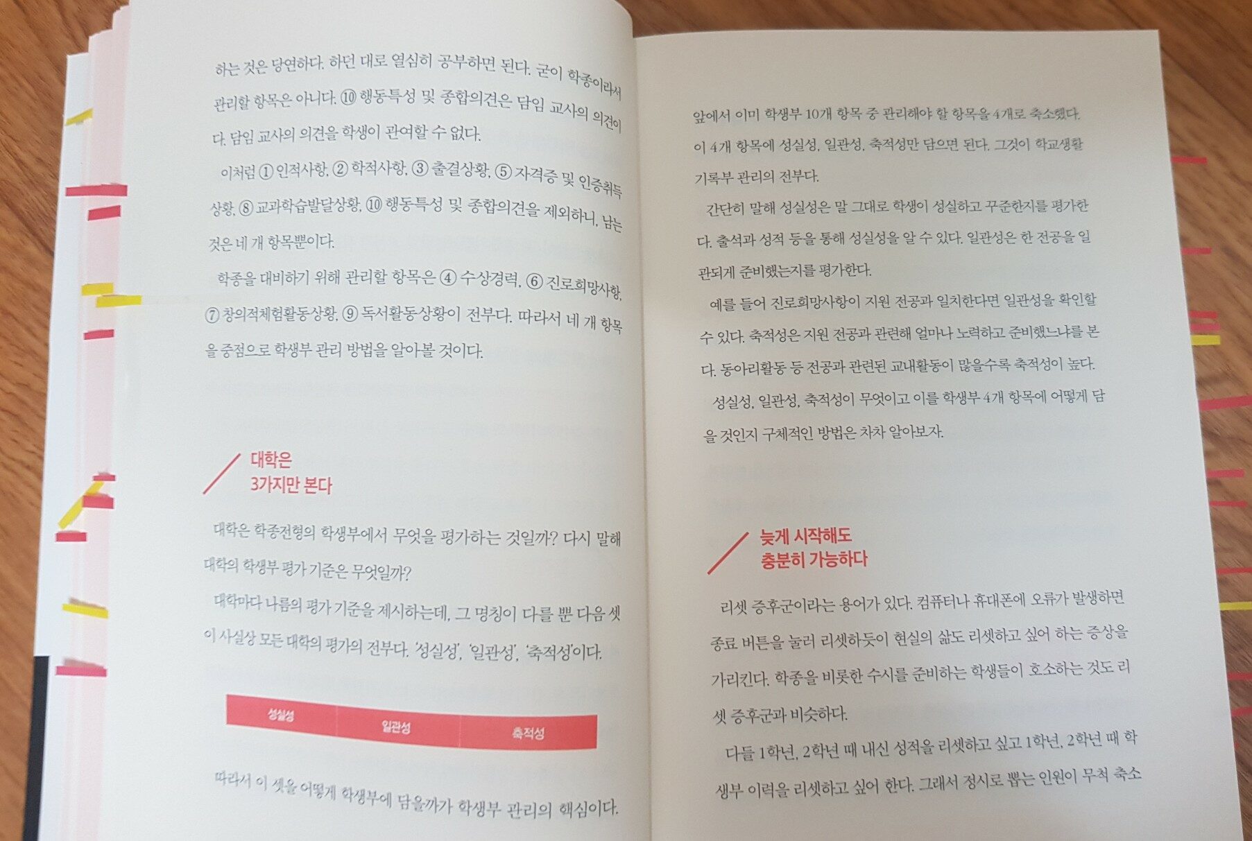 총 16챕터로 나누어 학생부종합전형 (이하 학종)에 대하여 정말 자세히 핵심을 짚고 있다. 처음엔 웬 챕터가 이렇게 많아 하고 걱정반 의심반이었는데, 자세한 설명과 필요한 부분을 바로 찾기 쉽다는 장정이 있어 다 읽은 후에야 책에대한 믿음이 생겼다. 먼저 본론으로 들어가기 전에 왕초보 학부모. 수험생을 위한 Q&A가 너무나 도움이 되었다.대학 입시의 기초부터 학생부종합전형의 기초까지 자세히 설명한다. 정시가 뭔지 수시가 뭔지,내신 5등급이 인서울하는 방법, 80%를 학종으로 선발하는 서울대,학종 선발 인원, 생활기록부, 자기소개서등 정말 다 알려준다. 본론 챕터로 들어가서는 기초 지식에 작가의 시크릿이 더해 졌다. 학생부, 3원칙의 이력서. 성실성 있는 학생부, 일관성 있는 학생부, 축정성 있는 학생부. 일급 시크릿인 자기소개서 쓰는 법과 실전 면접 까지. 어느 챕터 하나 버릴게 없었다. 개인적으로 너무나 입시에 문외한이라 지레 겁먹고 생각도 못하고 걱정만 하고 있어 정말 내가 고딩 엄마 맞았나 하는 반성하게 만들었다. '아직까지도 공부만 해라!' 오직 공부로만 승부를 걸려했던 무지한 엄마였다는게 부끄러웠다. 한편으로는 엄마의 도움없이도 지난 1년동안 스스로 학종 관리를 해 왔던 우리딸이 대견스러웠고, 이제부터라도 엄마도 든든한 지원군이 될 수 있다는 자신감이 생겼다.  다시 한 번 더 읽으며 정리하고 실전에 반드시 써먹겠다.