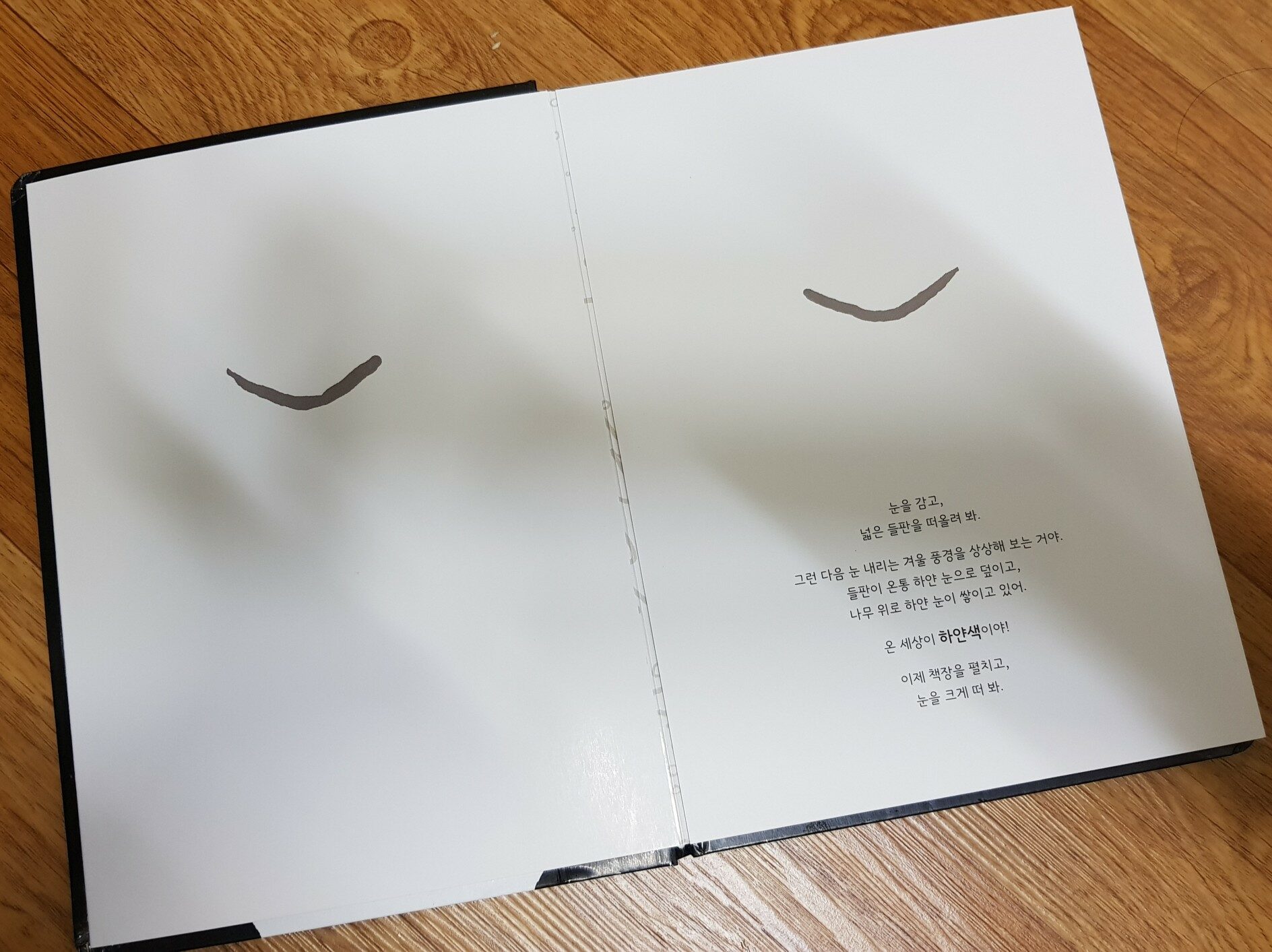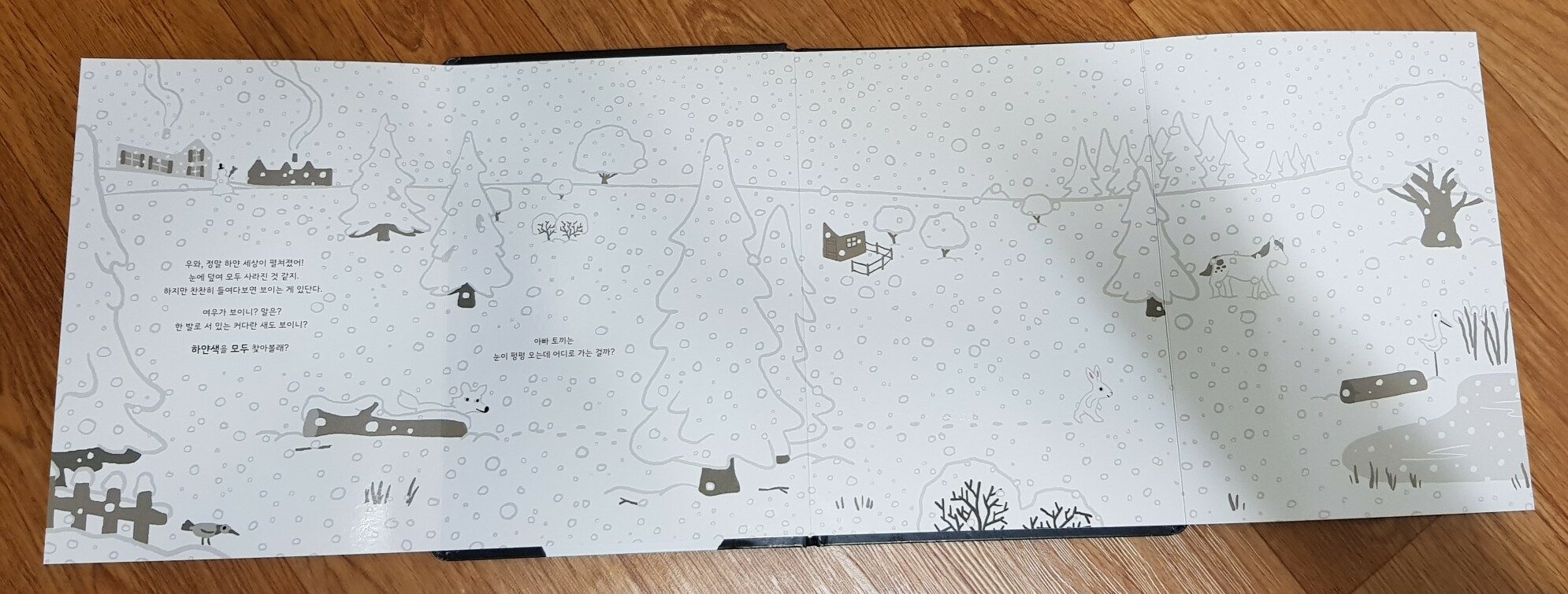 "펼치면 커지는 색깔 세상!" 까만 컽표지에 여러 색깔의 선명한 글자 《눈을 크게 떠 봐》 하얀 토끼가 활짝 웃고 있다. 토끼를 세상에서 제일 좋아하는 우리 막내 딸 이 책을 너무 좋아한다. "눈을 크게 뜨고 찬찬히 들여다봐 눈을 크게 뜨고 색깔을 찾아봐 눈을 크게 뜨고 나랑 놀자!" 첫장을 펼치니 하얀 토끼? 눈 감고 있는하얀 토끼처럼 보인다. 책을 펼쳐 보기전에 진짜 눈 감고 상상해 본다. "눈을 감고 눈 내리는 겨울 풍경을 상상해 봐! 온세상이 하얀색이야!" 책장을 펼쳐보기 전에 우리 딸이랑 이야기해본다. 눈 감고 무슨 생각했어? 아이의 상상력을 충분히 자극 시킨후 짜잔~~ 와우 엄청 큰 그림이 펼쳐진다. 정말 온 세상이 눈으로 덮어 있다. 이제는 눈을 크게 뜨고 찬찬히 숨어 있는 동물 친구 찾기 시간 누가누가 빨리 찾나. 여우가 어디 있지? 새는 찾았니? 하얀 또끼는 어디 있지? 두번째 색깔은 파란색. 파란색 하면 떠오르는 단어를 물어본다. 하늘 ~ 바다~ 다시 눈을 감고 상상해 본다. "눈이 그치고 하늘이 맑게 개었어 파란 하늘이 보이니?" 어떤 상상을 했니? 7가지 색깔 마다 아름다운 세상을 담고 있다. 여러 색깔 만큼 아이들의 상상력도 다양하게 쑥쑥 자란다. 아이들의 상상력과 집중력을 키워주는 멋진 그림책이었다. *출판사에서 제공하는 책을 읽고 작성한 리뷰입니다