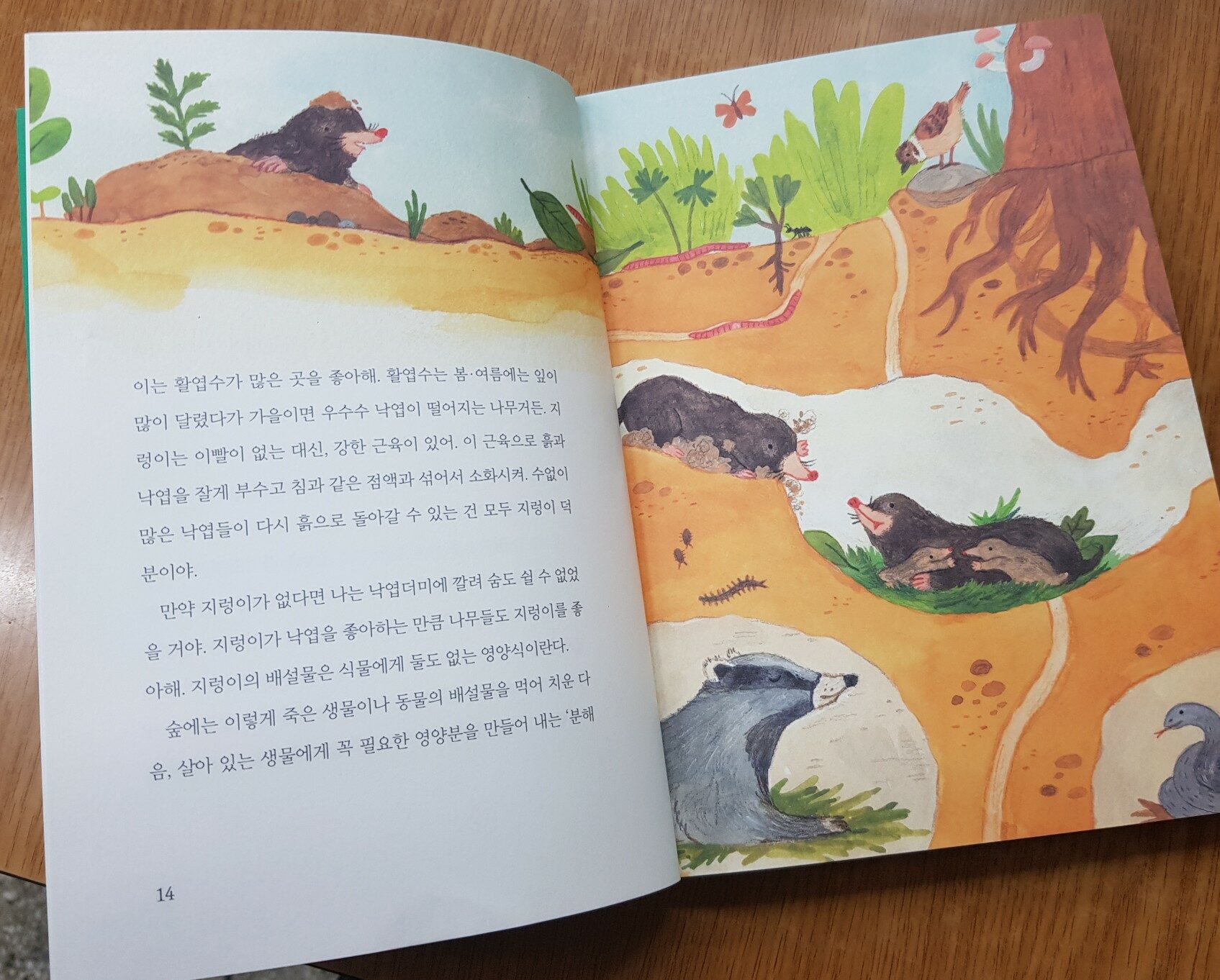 "지렁이가 도토리를 걱정하고, 벚나무가 개미를 꾀는 숲 이야기" 이 책의 주인공 숲이다. 숲이 1인칭 주인공이 되어 자신의 이야기를 들려주고 있다. 숲에 사는 다양한 동물과 식물들의 이야기를 생태학자자 들려주듯 자세히 쉽게 이해하도록 대화하듯 들려주고 있다. 어린이 책이지만 어른들이 읽어도 너무나 유용한 정보가 많아 아이와 숲을 걸으며 진짜 숲에서 나오는 소리를 듣는 듯 좋았다. 총 17개의 이야기가 실려있다. 지렁이와 두더지 두더지와 박쥐 ... 버섯과 이끼 이끼와 지렁이 꼬리에 꼬리를 물듯 지렁이 이야기로 시작해 지렁이 이야기로 끝난다. 서로 공통된 주제로 짝을지어 이야기를 해주어 서로 비교하며 읽는 재미도있다. 첫번째 숲속친구들은 <지렁이와 두더지> 공통된 주제는 '겉모습만 보면 안돼' 지렁이? 두더지 둘다 아이들이 징그럽게 생각하는 동물들이지만 겉모습과 달리 숲속 땅속에서 매우 중요한 역할을 하는 동물들이다. 숲의 말을 빌려보면 "만약 지렁이가 없다면 나는 낙엽더미에 깔려 숨도 쉴 수 없을 거야." 이야기 중간중간에? <한 뼘 더 알기>가 있다. 좀 더 아이들이 궁금증을 가질 수 있는 소재를 다루고 있어 호기심 자극과 상식에도 도움이 된다. <함께 해 봐요> 페이지에서는 숲에서 우리 아이들이 숲체험 활동을 할수 있게끔 만들기나 놀이등 다양한 방법을 알려주고 있다. 관찰 활동도 할 수 있어 과학적 접근도 흥미롭고 유익했다. 살아? 있는 모든 생물들은 서로 도우며 어려움을 이겨내고 있다. 숲속 생물들고 서로를 소중하게 생각하며 공생하고 있다. 숲에 가서 눈으로 직접 보고 만져보고 느끼는게 가장 좋은 경험이지만 이렇게 좋은 책으로 간접 체험도 아이들에게 좋은 경험이 될 것이다. *출판사에서 제공하는 책을 읽고 작성한 리뷰입니다