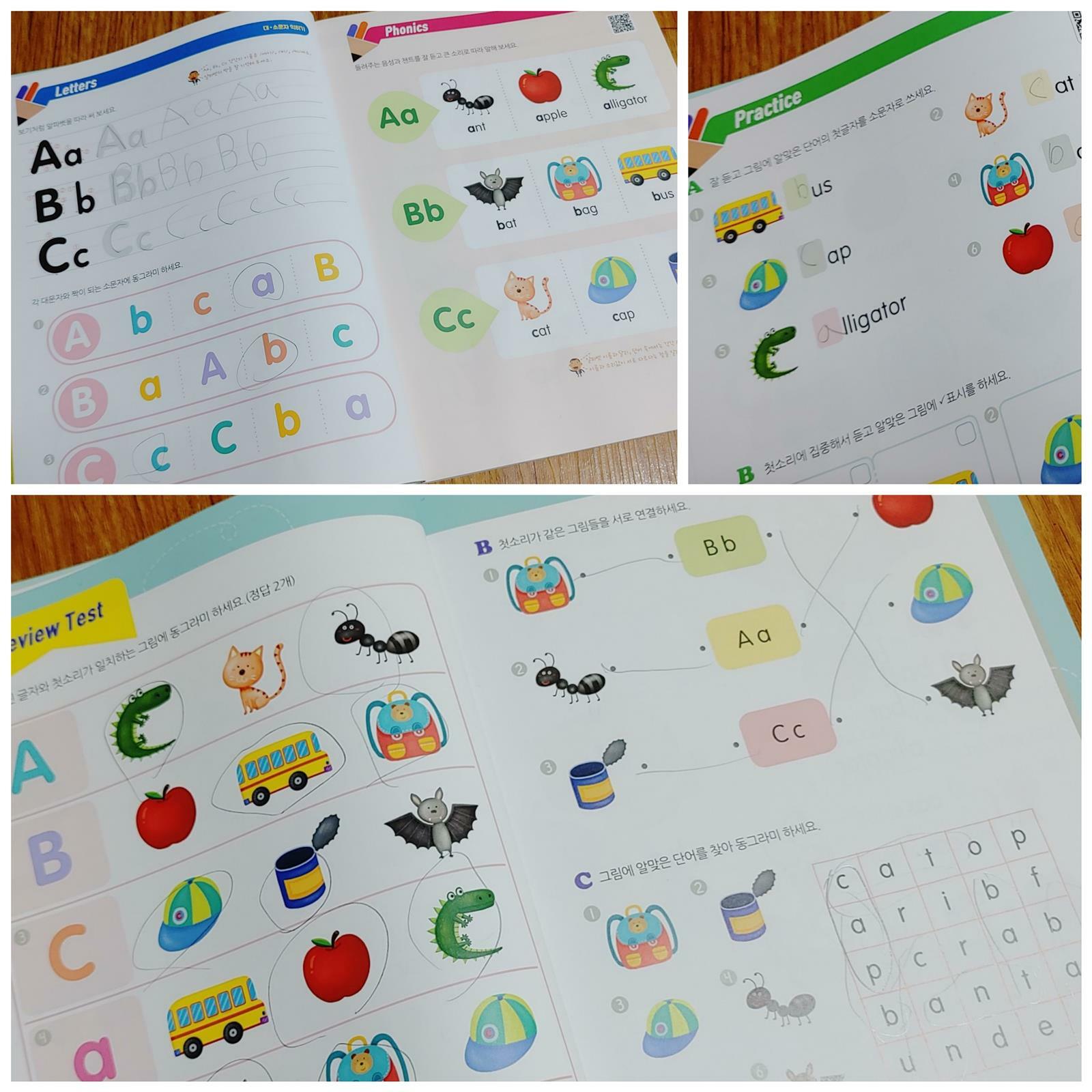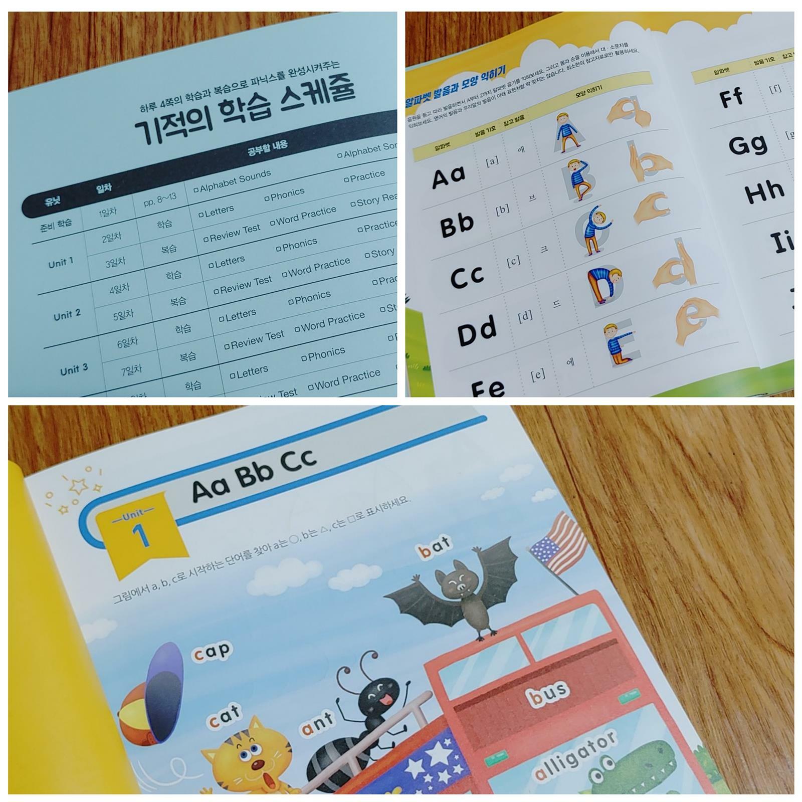 올해 초등학생이 된 막내딸. 6월부터 학교 방과후 수업으로 영어를 선택하고 파닉스를 배우고 있어요. 또래 친구들보다 영어 학습이 많이 늦었어요. 영어에 별 관심이 없어 억지로 시키지 말자라고 엄마가 아이 영어 학습에 소홀했어요. 방과후 수업에서도 파닉스 장모음을 하니 아직 알파벳도 모르는 우리 딸에게는 많이 어려운가 봅니다. 이제라도 <기적의 파닉스 1> 책으로 알파벳부터 엄마랑 함께 차근차근 학습하려 합니다. 하루 4쪽, 3개월이면 혼자서도 영어책 읽기가 가능해지는 <기적의 파닉스 1> 기적의 파닉스는 전 3권 시리즈입니다. 먼저 1권에서는 알파벳 26자를 8UNIT으로 나누어 하루 4페이지씩, 20일이면 1권이 끝나게 구성되어 있어요. 파닉스 시리즈 3권까지 끝내는데 3개월이면 가능하네요. 하루 4페이지 부담 없는 공부량이 제일 마음에 듭니다. 먼저 기적의 학습 스케줄을 따라 하면 완북할 술 있기에 별도의 계획이 필요 없네요. 알파벳 발음과 모양 익히기 본격적인 알파벳 학습전에 대문자 소문자의 모양을 알아보는 페이지가 있네요. Unit 1 Aa, Bb, Cc 알파벳도 써보면서 대문자 소문자를 익힙니다. 그리는 수준이네요. 예전에 유치원에서 학습한 기억이 나는지 Aa로 시작하는 단어들을 알고 있는 게 너무 신기했네요. 각 알파벳마다 3개의 단어도 학습합니다. 챈트로 따라 하면서 자연스레 단어를 익히게 됩니다. 연습문제 푸는 페이지에서는 앞에서 배운 단어들의 첫소리를 익히면서 알파벳을 다시 한번 더 복습하게 됩니다. 알파벳과 함께 단어를 탄탄하게 익히면 1일차 학습이 끝이 납니다. 어렵지 않고 재밌게 부담 없이 학습할 수 있네요. 2일차 수업에서는 1일차 배운 알파벳과 단어들을 더 많이 연습하는 페이지로 구성되어 있어요. "Story Reading"으로 문장까지 읽기 연습할 수 있어요. 딸이 좋아하는 미로 찾기 게임으로 2일차 학습을 마쳤어요. 그 외 단어 카드와 별책 부록 "Story Book"까지 알찬 구성이 눈에 들어옵니다. 이제 영어 학습 시작인 우리 딸에게, 매일 규칙적으로 부담 없는 학습시간으로 재밌게 꾸준하게 영어 학습을 이어갈 수 있도록 도와주는 많은 기대가 되는 책입니다.