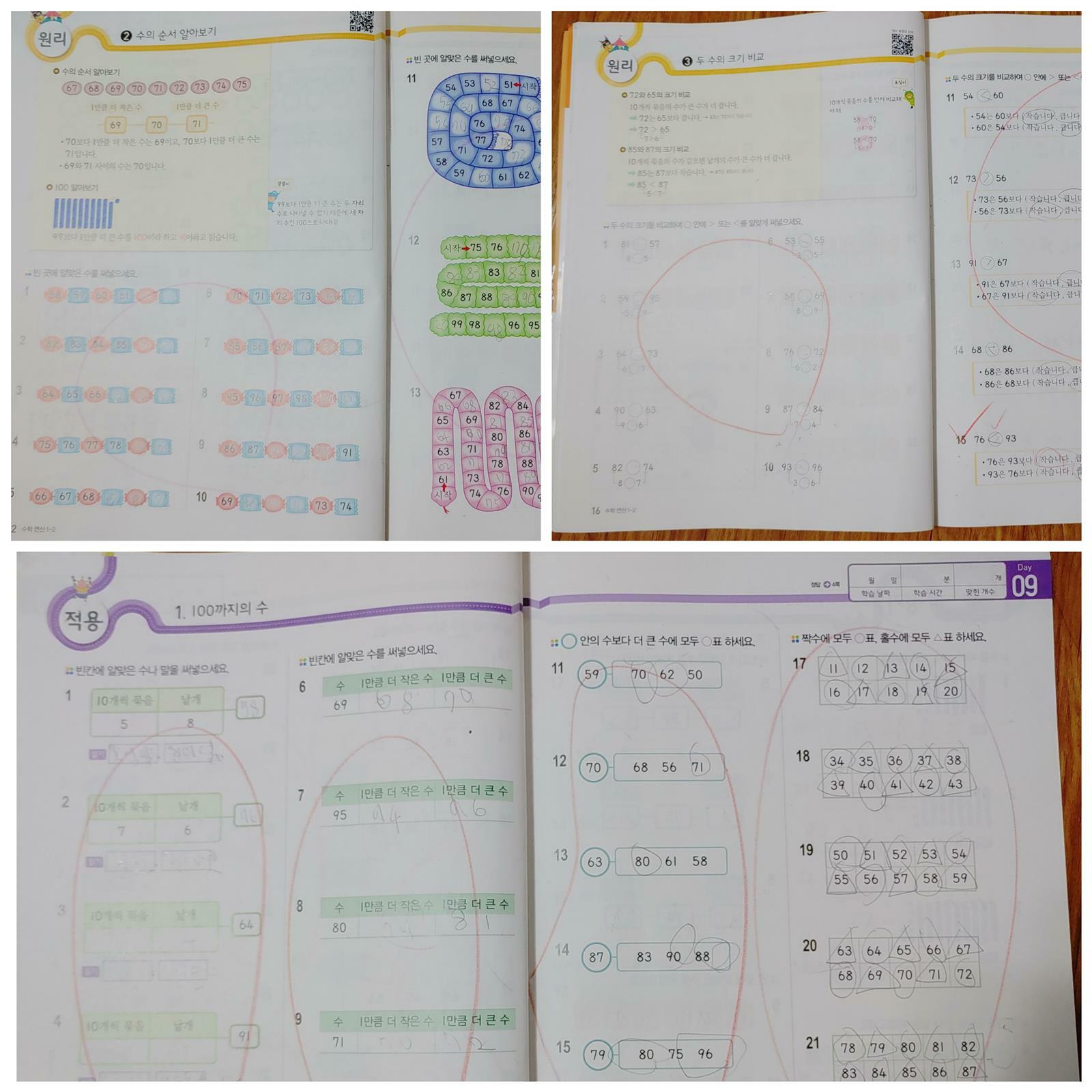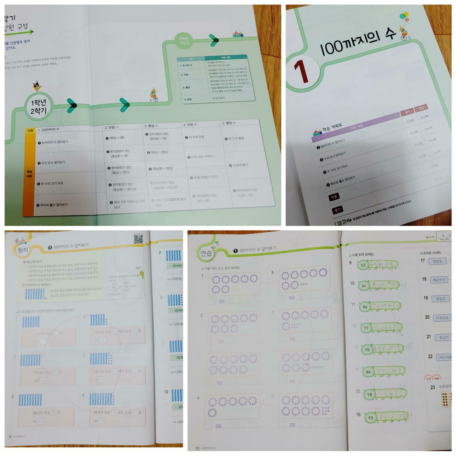 다음 주면 여름방학이 시작된다. 3월 초등학교 입학이 엊그제 같은데 시간이 너무 빠르다. 2학기 예습과 연산의 자신감을 길러주기 위한 엄마의 선택!! 빠른 계산, 빠른 연산! 초능력 수학 연산 1-2 하루 2쪽 10분이면 하루 공부 끝! 부담 없는 공부량이지만 매일 꾸준히 하다 보니 벌써 1단원 학습이 끝났다. 먼저 1학년 2학기에 배울 단원 구성부터 살펴본다. 1단원에 100까지 수를 익힌다. 1학기에 50까지 익히면서 미리 학습했는데 우리 딸도 어렵지 않게 1단원 학습이 끝났다. 물론 아직 어려 실수가 많이 보이지만 엄마 찬스 없이 혼자서도 척척 푸는 걸 보니 대견하다. 예순, 일흔, 여든, 아흔으로 읽고 쓰는 것도 척척 푼다. 수 모형을 보고 수를 학습하니 수의 개념을 확실하게 잡아준다. 책은 <원리>, <연습>, <적용>, <평가> 이렇게 4단계로 구성되어 있다. <원리> 단계에서는 QR코드를 스마트폰으로 찍어 연산 원리를 무료로 동영상 강의를 들을 수 있다. <연습><적용>단계에서는 문제 해결하는 능력을 키울 수 있도록 많은 문제를 풀 수 있다. <평가> 한 단원을 마무리하는 페이지로 종합적인 문제를 풀면서 아이의 실력을 확인할 수 있다 짝수, 홀수 알아보는 시간도 가졌다. 25가 짝수인지 홀수인지 맞추기 위해 25개 동그라미를 그리고 둘씩 짝을 지어 풀더라고요. 엄마가 없는 동안 할머니랑 풀면서 혼자 생각해서 풀었다고 하니 정말 놀랍더라고요. 매일 혼자서 척척 풀어내니 수학의 기초가 차곡차곡 쌓이는 기분입니다.