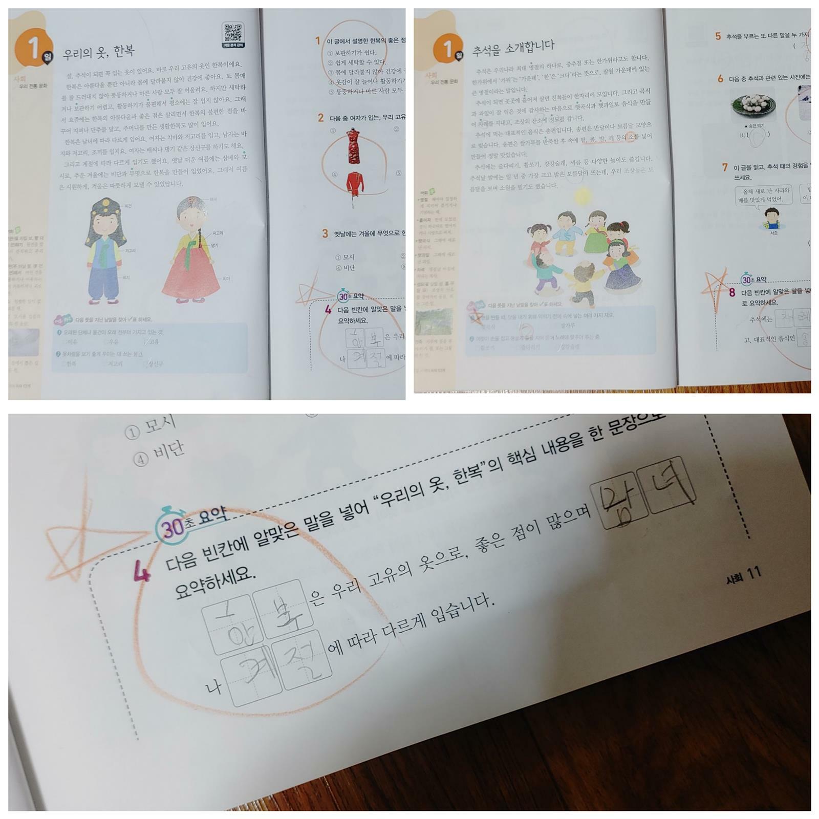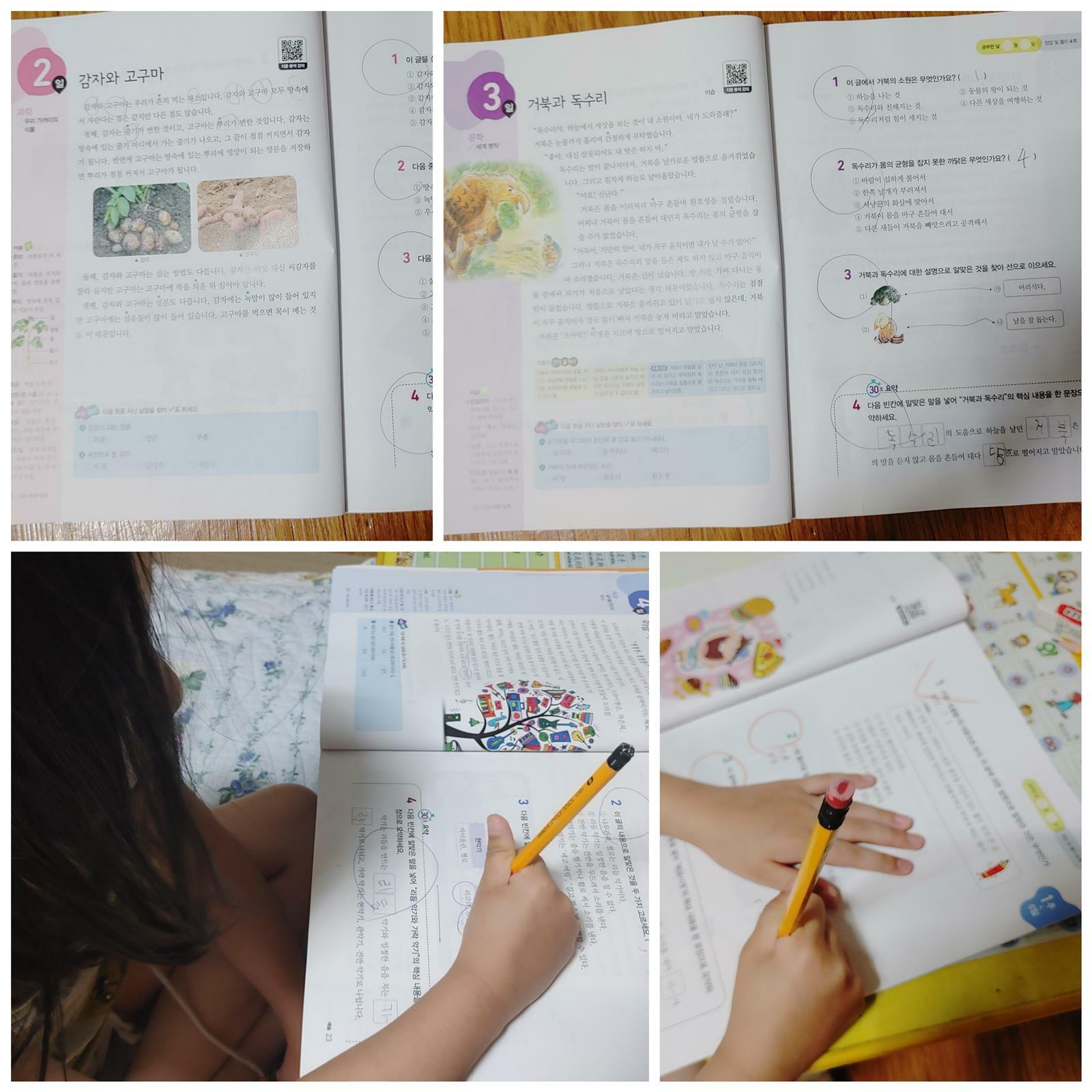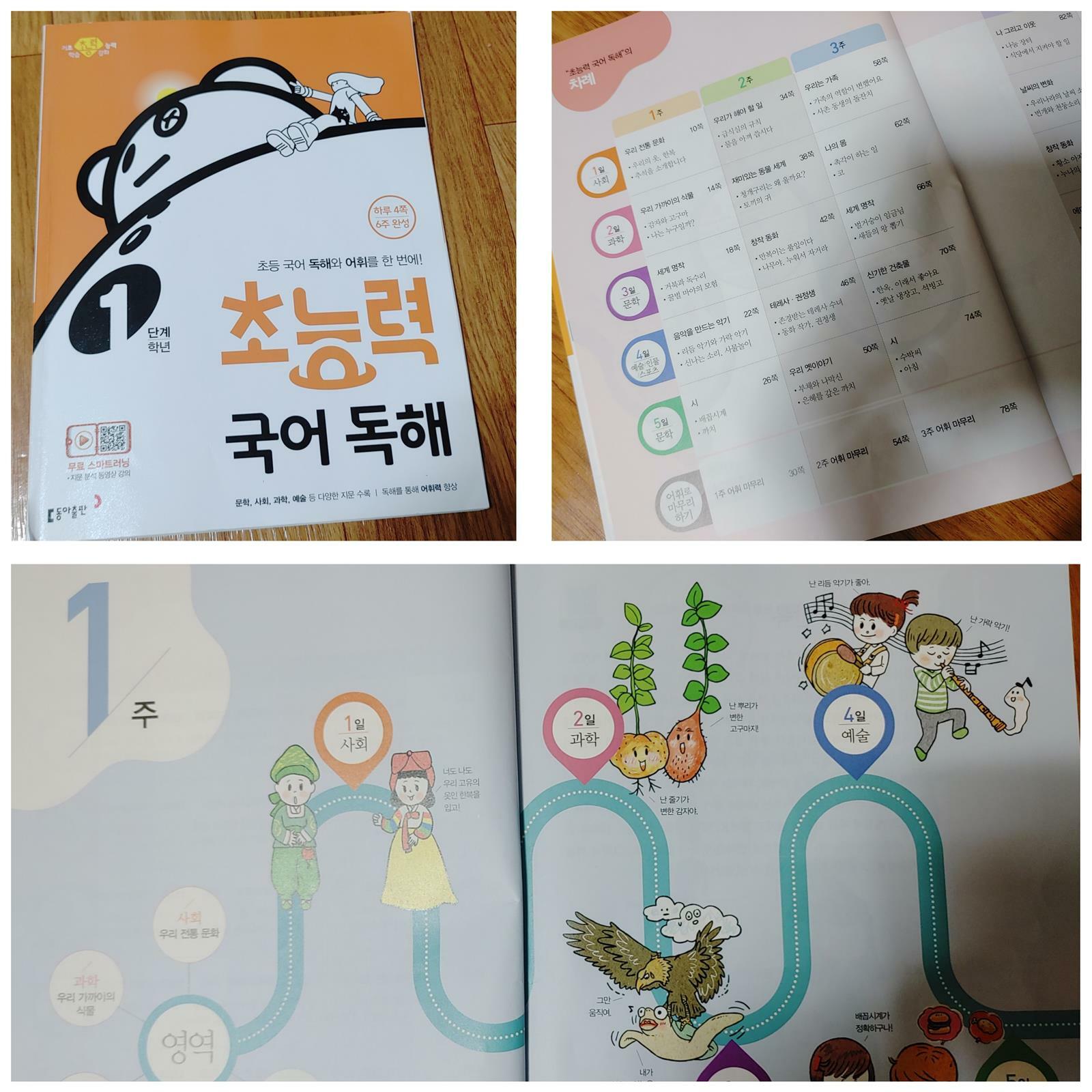 먼저 1주일 분량을 학습해 보았습니다. 매일 하루 4쪽 6주 완성 초등학교에 입학하니 수학뿐만 아니라 솔직히 국어가 더 걱정이었습니다. 평소에 책을 즐겨 읽는 아이가 아니기에 독해 문제집으로 아이의 읽기 능력이 길러지길 바랄 뿐입니다. 초등 국어 독해와 어휘를 한 번에! 초능력 국어 독해 1단계 1학년 초능력 국어 독해의 가장 큰 장점은 문학, 사회, 과학, 예술 등 다양한 지문을 만날 수 있다는 점입니다. 평소 만화책을 주로 읽다 보니 정독할 수 있는 기회가 많이 없었는데 다양한 지문을 읽으면서 독해력까지 길러주는 문제집이 너무나 반갑네요 첫날 우리 딸에게는 조금 어려웠나 봅니다. 사회 지문으로 우리의 옷, 한복에 대해 알아보았는데요. '고유', '장신구' 등 새로운 어휘가 많이 나와 어렵다고 합니다. 문제 푸는 것은 그래도 잘 푸는데 <30초 요약>를 많이 낯설어해서 엄마와 같이 풀었네요. 정말 새로운 어휘도 익히고 또박또박 글 읽는 습관도 길러주는 시간이었습니다. 감자와 고구마의 글을 읽을 때는 새로운 지식을 알았다면 좋아하네요. 평소 감자와 고구마를 엄청 좋아하는 딸이라 자신이 좋아하는 것에 대해 자세히 알아가는 시간이 흥미로웠나 봅니다. 지분 분석 강의도 무료로 만날 수 있어요. QR코드를 찍어 매이 ㄹ새로운 지문의 분석 방법을 배우는 시간이라 많이 도움이 되네요. 가장 재밌게 공부한 영역은 5일차 문학, 시를 읽는 시간이었어요. 소리 내어 시를 읽는 모습이 이쁘더라고요. 하루 4페이지 부담 없이 지문 읽고 문제 풀다 보니 독해 시간이 금방 끝납니다. 엄마 입장에서는 이제 1학년이라 공부에 부담은 주기 싫지만 그래도 공부 습관을 길러주고 싶은 마음이 크기에 초능력 국어 독해 문제집이 너무나 마음에 듭니다.