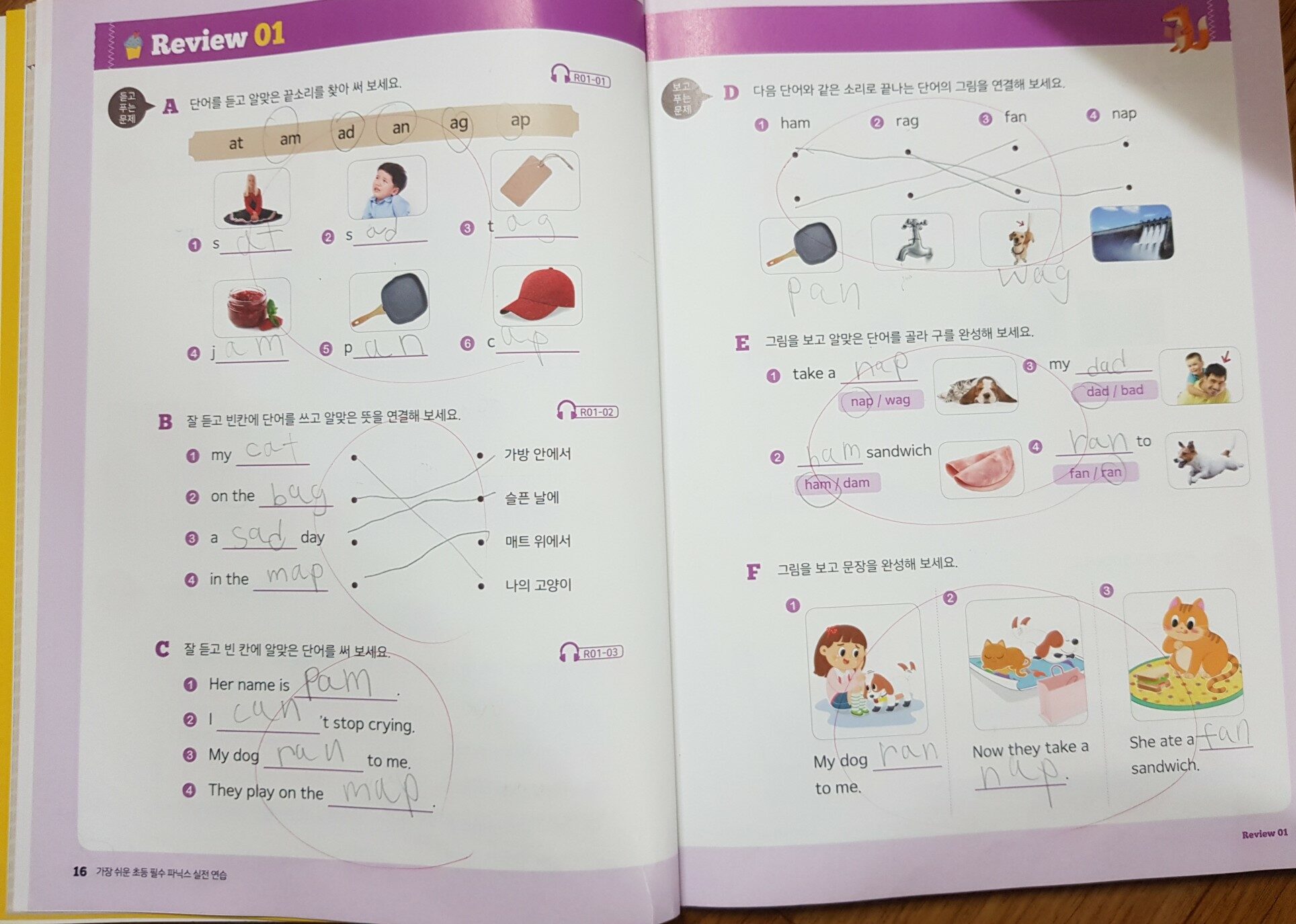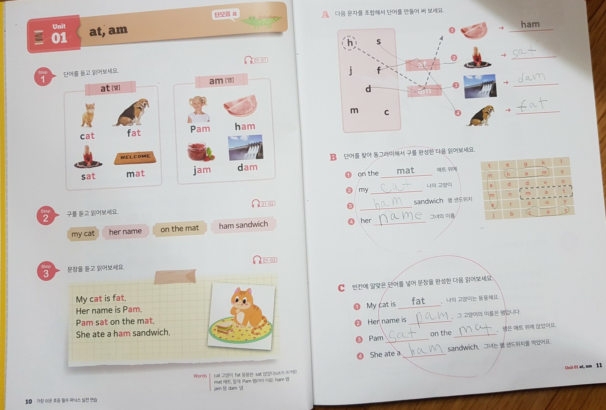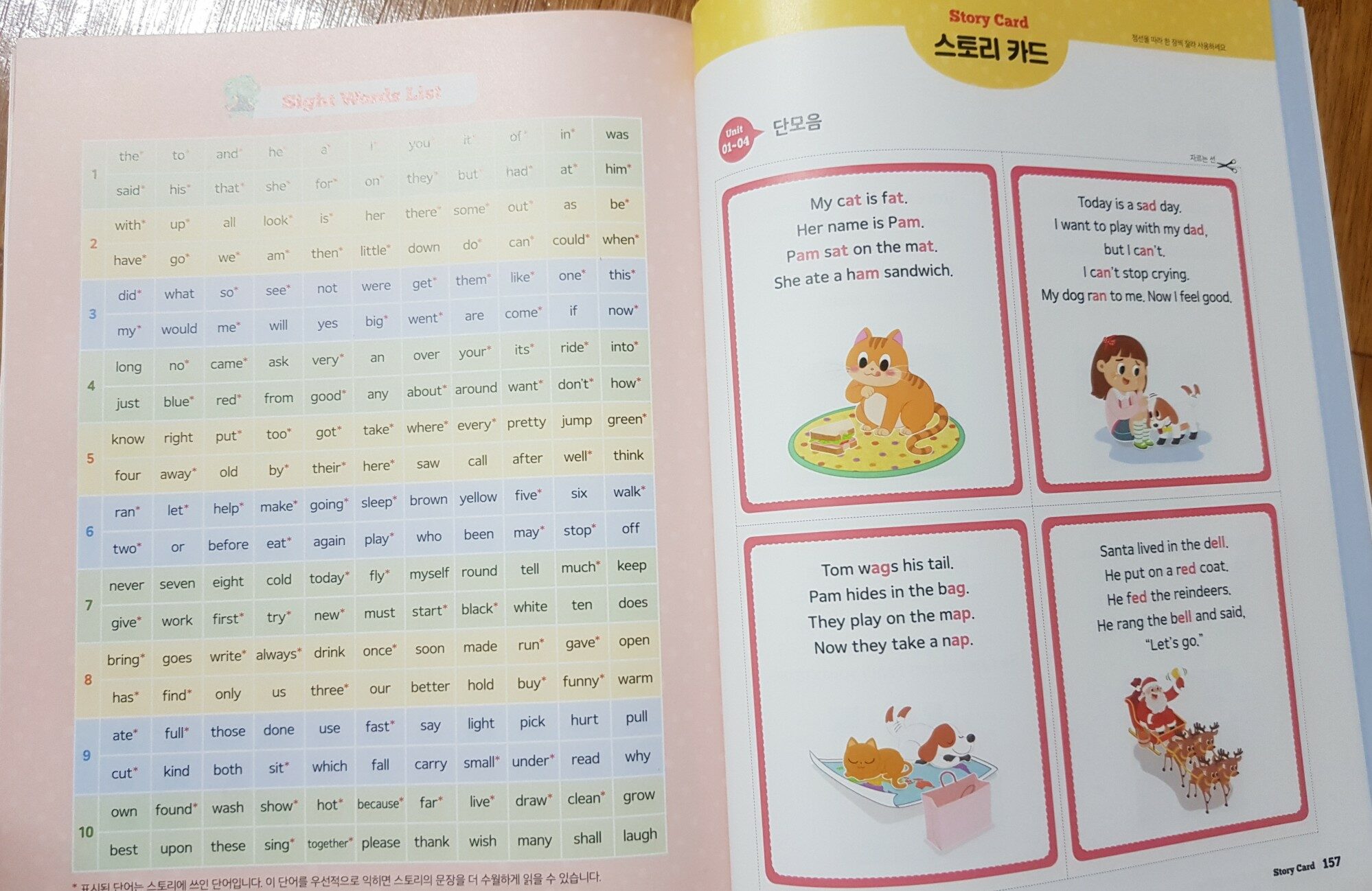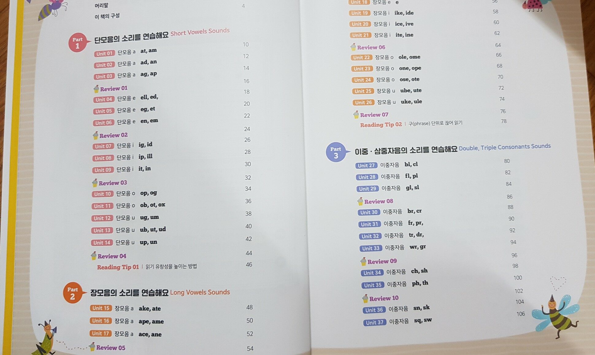 이 책을 학습하기에 가장 좋은 점은 파닉스로 음가를 익히고 단어를 익히는데 그치지 않고 2~3개의단어로 구성된 구를 익히고 다음에는 문장을 익히는 점진적이고 체계적적이며 효과적인 학습방법을보여준다는 것이다.
