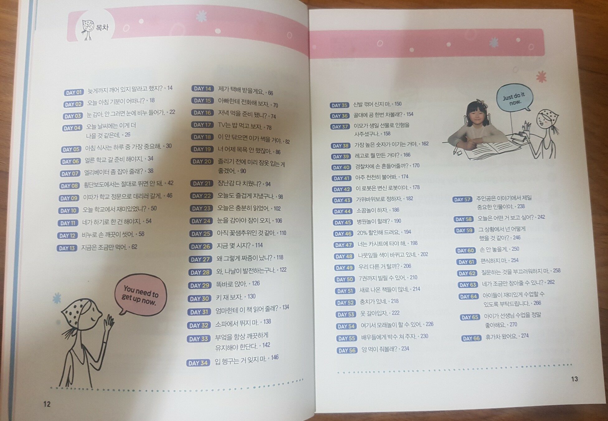 책 내용은 간단한 형식 패턴으로 반복되어 있다. 우선 중요 생활영어 7~ 8문장을 익힌다. 대화 형식을 실어 놓아 아이와 함께 영어 대화로 생활 영어를 반복 연습할 수 있다. '표현 활용하기'에서는 한 문장을 연습하는 패턴이다. 문법 설명도 빠지지 않아 한 패턴 연습으로 여러 문장으로 표현 할 수 있도록 다양한 예시를 실었다.