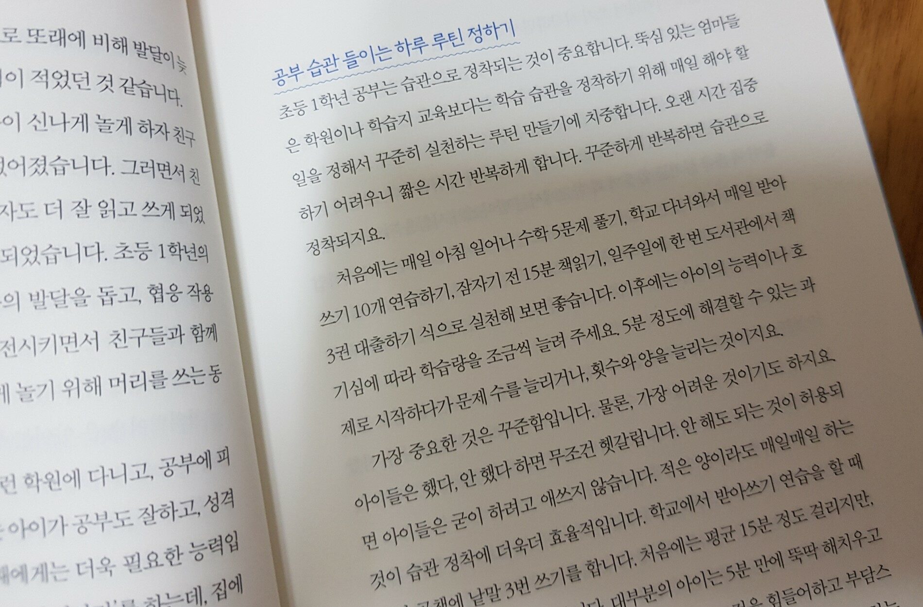 "초등 1학년 공부는 습관으로 정착되는 것이 중요합니다. 뚝심 있는 엄마들은 학원이나 학습지 교육보다는 학습 습관을 정착하기 위해 매일 해야 할 일을 정해서 꾸준히 실천하는 루틴 만들기에 치중합니다."p61