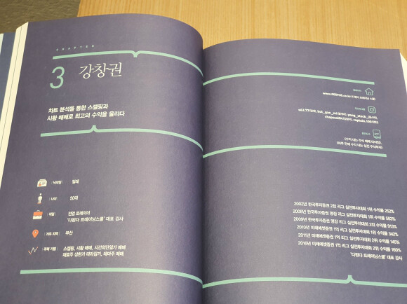 인터뷰를 시작하기 전 가장 앞 장에 닉네임 나이 직업 거주 지역 주력 기법에 대해서 설명해놓았고, 운영하고 있는 홈페이지, 네이버 카페 또는 출판한 책, 그리고 경력에 대해서도 세세하게 적어둬서, 인터뷰를 읽기 전에 사전 지식을 알고 시작할 수 있었습니다. 또 바로 다음 장엔 이어서 트레이너들의 과거부터 현재까지 주식을 언제 시작했는지와 또 겪었던 일들에 대해서도 적어두셨는데, 시작은 다들 비슷하구나라는 느낌을 받았습니다. 처음부터 잘하는 사람만이 존재하는 건 아니구나 그런데 트레이너들과 지금 나의 다른 점과 차이점은 뭘까를 생각하면서 읽기 시작했습니다.