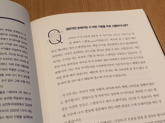만약 저에게 주력 기법이 뭐냐고 물어본다면 사실 딱히 말씀드릴 게 없습니다. 단타를 하려고 했다가, 고점에서 물려서 강제로 버티면서 중장기로 바뀌는 것이 대부분이기 때문인데요. 단기 투자 기법으로 스캘핑, 데이트레이딩, 스윙 등 본인의 기법에 대해서 설명을 해주면서 어떤 타이밍에서 매도와 매수를 하는지 또 위험관리에 대한 노하우 등 본인들의 경험을 기반으로 한 정말 보물 같은 인터뷰 내용들이 많았습니다. 많은 트레이더 분들이 시장을 이기려고 하지 말자. 시장에 겸손해라. 기법보다 중요한 것은 자신만의 원칙이다. 또 실패를 겪었을 때 계속 이어가지 말고 환기를 시켜줘야 한다고 말해주셨는데요. 사실 굉장히 기본적인 이야기들인데, 전쟁터같은 주식장에서 정말 큰돈을 잃으면 쉽사리 실행하기 어려울 것 같다는 생각이 들었어요. 또 자신만의 원칙을 고수하고 지키기란 어려울 것 같은데 크게 강조를 하시더라고요.