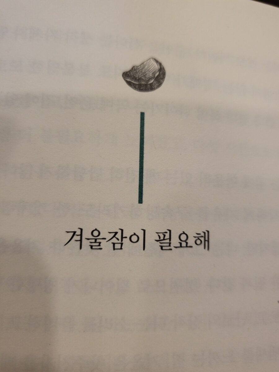 겨울을 참 좋아하던 나였는데 요즘은 입에 달고사는게 나 겨울잠 잘거야 나 찾지마 하는 내모습과 저자의 모습이 너무 비슷해서 내 모습이 이랬나 싶어 웃음이 났다.