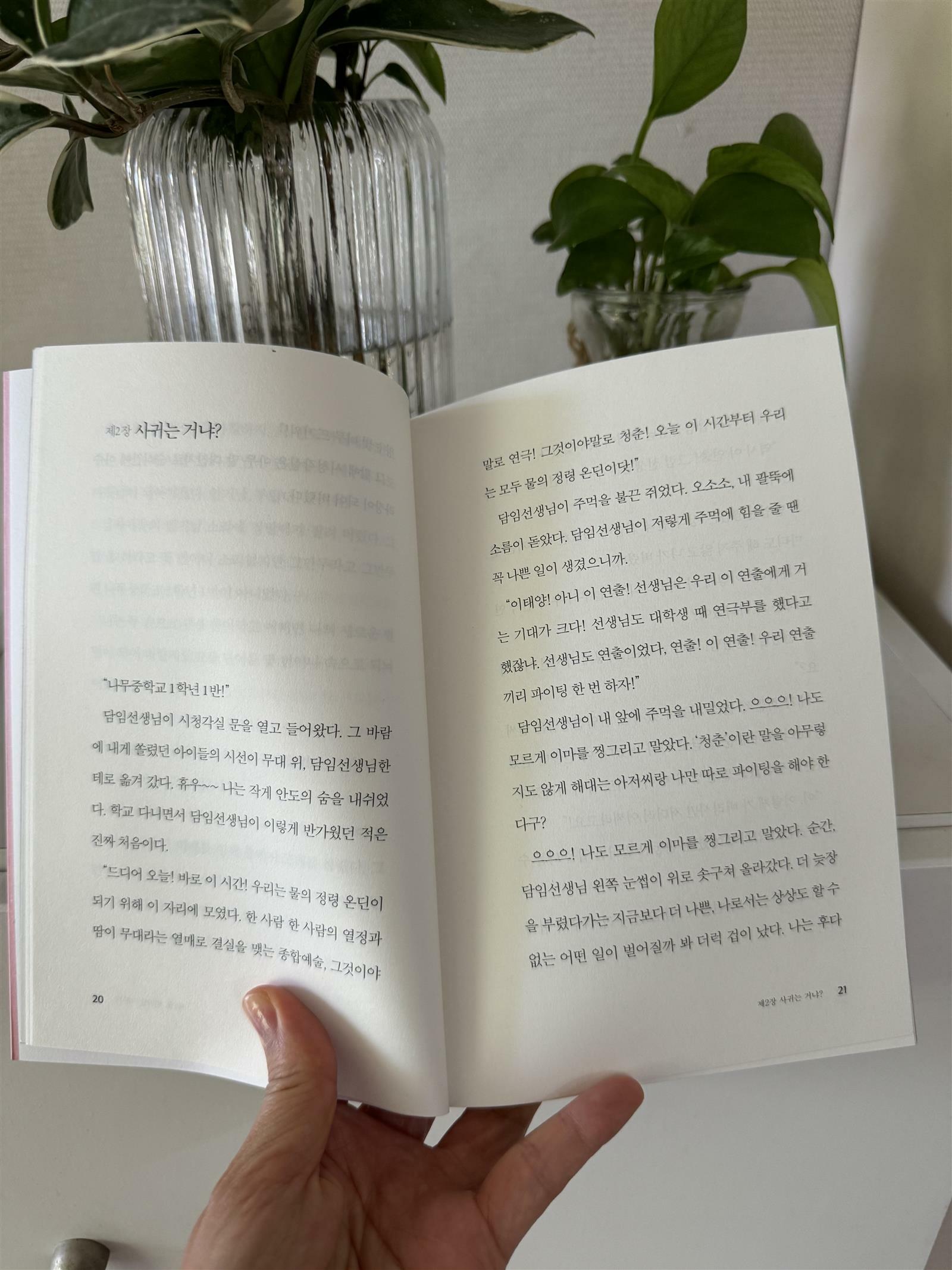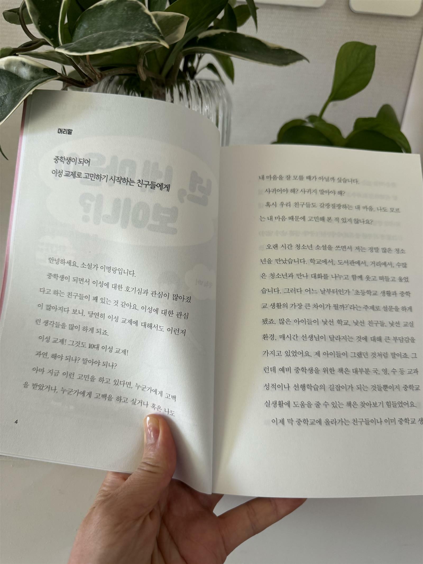 넌, 네 마음이 보이니? 『넌, 네 마음이 보이니?』는 갓 중학교에 입학한 현정이와 태양이의 좌충우돌 중학 생활을 담은 청소년 소설이다. 중학교 국어 교과서에 수록된 『내 마음을 아는지 모르는지』, 『사춘기라서 그래?』를 쓴 이명랑 작가가 초등학교 때와 확연히 달라지는 중학교 생활에 대해 걱정하는 아이들의 다양한 고민을 다룬 [중학 생활 날개 달기 시리즈] 4편이다. 사귀어야 해? 사귀지 말아야 해?! 4넌 도대체 무슨 생각을 하는 걸까? 난 왜 자꾸 그 애 눈치를 보는 거야?" 드디어 중학교의 첫 여름 방학에 접어든 나무중학교 1학년 1반! 축제를 위한 연극 연습에 돌입한 가운데, 태양이는 나무중학교에서 제일 예쁘다고 소문난 여학생에 게 고백을 받는다. 과연 태양이는 자신의 마음을 찾을 수 있을까? 나도 모르는 내 마음을 들여다보고 다독이고 찾아가기 위한 이명랑 작가의 <중학 생활 날개 달기> 시리즈 4편! 이 책을 아이와 함께 읽으며 이성교제에 대해 충분히 이야기를 나누기에 좋은 책인듯했대. 우리 아이는 5학년이지만 요즘 교실에서 보면 벌써 커플이 있다고 하기도 하고 실제 수업시간에도 사귀는 친구들이 있기도 하다. 이 책에서 나오는 태양이의 모습을 보면서 미애와의 불편한 관께를 개선하기 위해서 태양이는 어떻게 해야 했을지에 대해서 생각해 보는 기회를 얻었다. 우리 아이은 책을 읽고 많은 생각에 빠진 듯 하였다. 태양이가 정말 착하기만 해서 미매을 그냥 받아주는 것인지 아니면 그 예쁜 아이가 거절을 하면 상처를 받을까 두려운 것인지 또다른 이유는 없을 것인지 말이다. 항상 최선의 선택을 하기 위해서 얼마나 생각을 하고 결정을 해야하는지에 대해서 고민을 많이하는 시간을 갖을 수 있어서 엄마로서는 아이와 함께 읽어보고 이야기 나누며 생각을 키울 수 있는 장점이 있어서 좋았다. 책을 읽는 여러가지 이유가 있겠으나 우리집 독서습관은 책을 읽고 이야기를 나누는 것에 촛점을 두기때문에 함께 책을 읽고 생각을 나누는 부분에 시간을 많이 할애 하는 편이다. 특별이 어제는 주말이라 이이와 카페에서 이야기를 나누며 진지하게 어떤 이성교제가 가장 합리적인지에 대해 한참 이야기를 나누었고 어제 내린 결론은 인간의 개별성에 대해 인정하자는 것 그러므로 각 개인의 개별성을 인정하고 나와 맞는 말아 잘 통하며 편안한 남친을 사귀어 보아야겠다고 아이는 잠정 결론을 내렸는데 아직도 머리속이 복잡해 보였다. 이 책을 읽으며 책 내용자체도 너무 흥미롭고 좋았지만 주제를 갖고 아이와 이야기 나누기에도 좋은 책이였다.