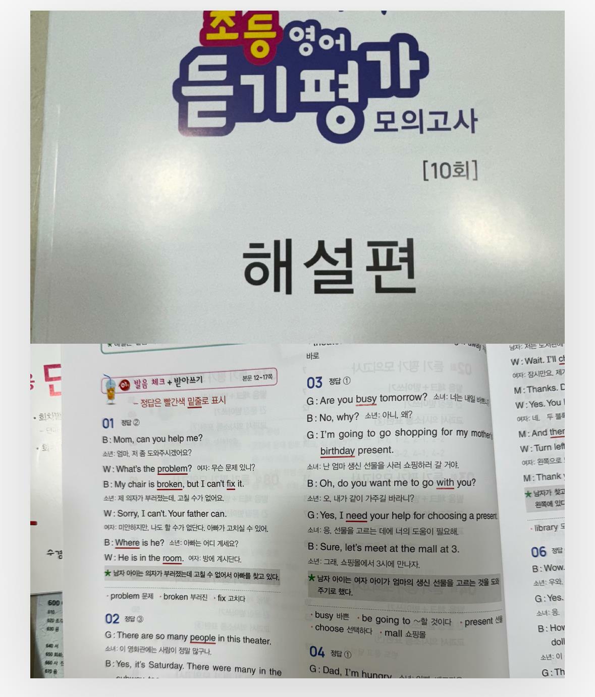 해설집도 더 많이 도움이 되는데 모의고사의 모든 스크랩트가 들어 있어서 정답을 확인하면서 듣기를 다시 확인하고 받아쓰기를 다시 확인 하는데 도움받을 수 있어요.