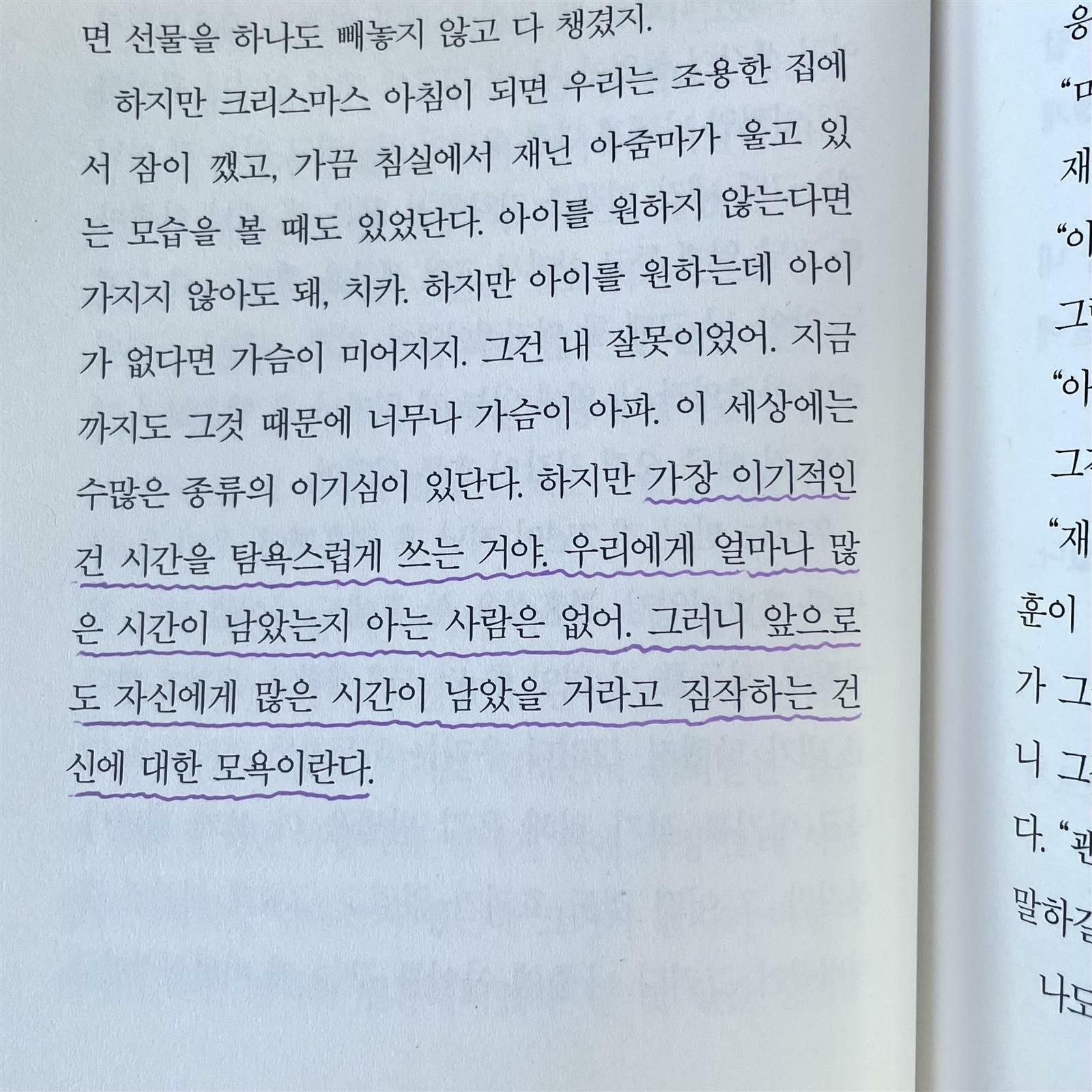 가장 이기적인 건 시간을 탐욕스럽게 쓰는 거야. 우리에게 얼마나 많은 시간이 남았는지 아는 사람은 없어. 그러니 앞으로도 자신에게 많은 시간이 남았을 거라고 짐작하는 건 신에 대한 모욕이란다.