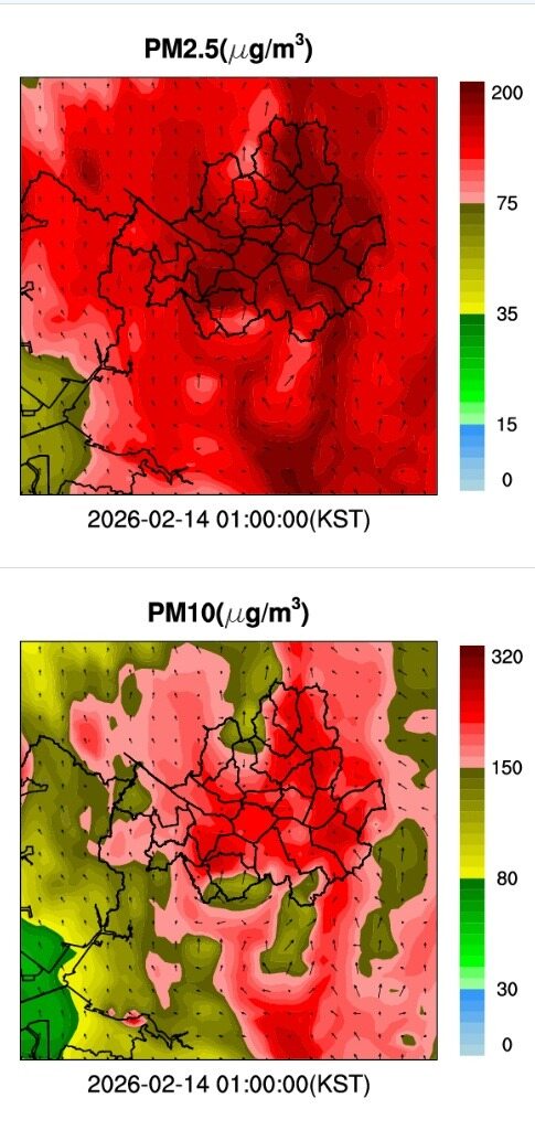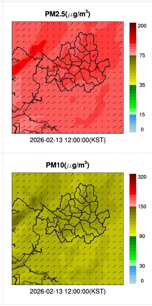 2월 13일 금요일 08시부터 14일 토요일 12시까지 초미세먼지, 미세먼지 최악이