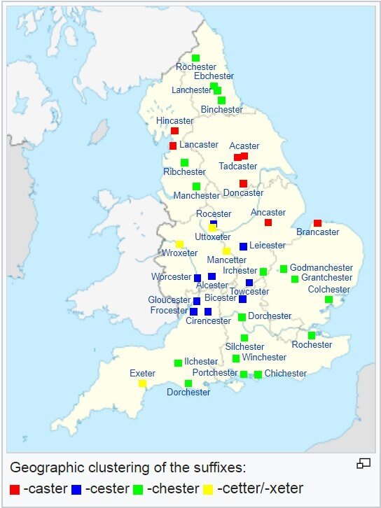영국은 맨체스터, 로체스터 등 chester계열 도시는 로마군 주둔지 카스트라castra에서 비롯된 말이다. 로마군이 지은 도로망을 그대로 사용한다. 엑서터 Exeter까지 같은 게열이다. 프랑스는 마을 빌(ville도시). 루이즈빌. 몽(산)을 붙인 곳이 많다.