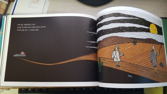 드디어 그림책 시작. 이야기는 낙조의 시간부터 시작된다. 박완서 작가의 세심한 문체가 드러나는 문장들 속에 앞을 바라보는 노인과 불안한 시선으로 뒤를 돌아보는 소년이 등장했다. 이 둘은 어떠한 관계인지 독자는 아직 알 수 없다. 그리고 이들이 지금 어디를 왜 가고 있는지도 알 수 없다. 그런데, 다음 장에서 노인은 아이에게 앞으로 아이가 살 고장을 찾아주는 이야기를 건낸다. 아이 이름을 부르지 않는 것으로 보아 가족이 아님을 짐작할 수 있다.