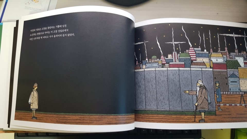 횃불을 든 노인이 앞서 걷고 불안한 눈길로 뒤를 돌아보는 소년이 다른 고장을 찾아 떠나면서 그림책은 끝난다.