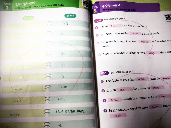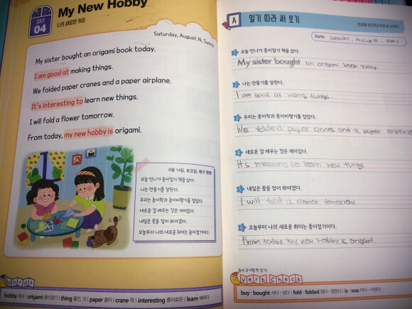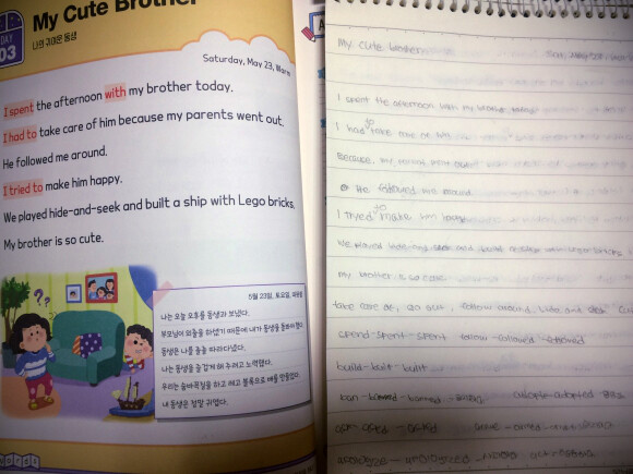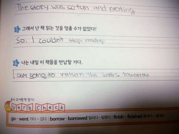 제가 해석을 읽어주면 배운 영어 패턴으로 써보기를 했어요.