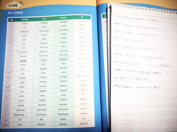영단어와 함께 동사 변화표를 보며 4개씩 외워보기로 했어요.