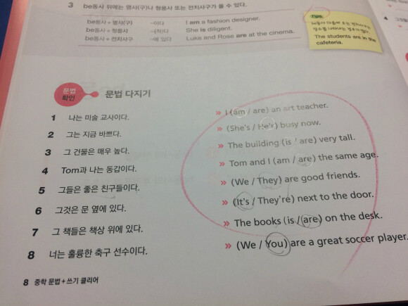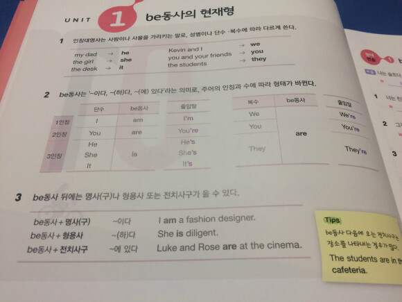 중요 핵심문법과 노란 박스안의 Tips도 놓치지 않고 보며 be동사의 현재형을