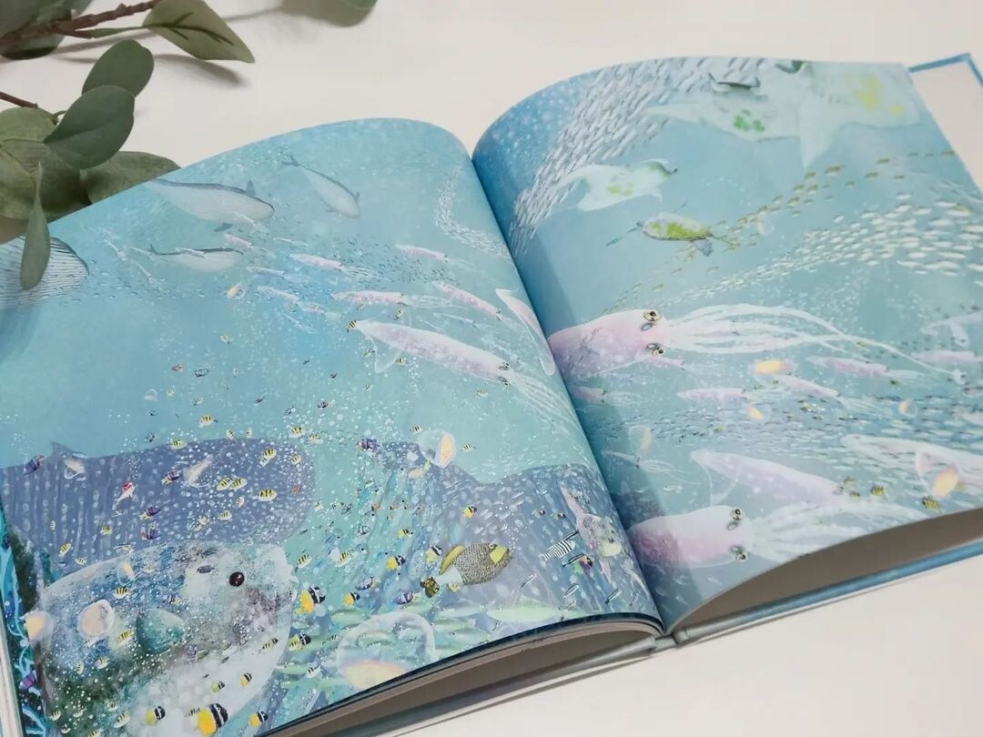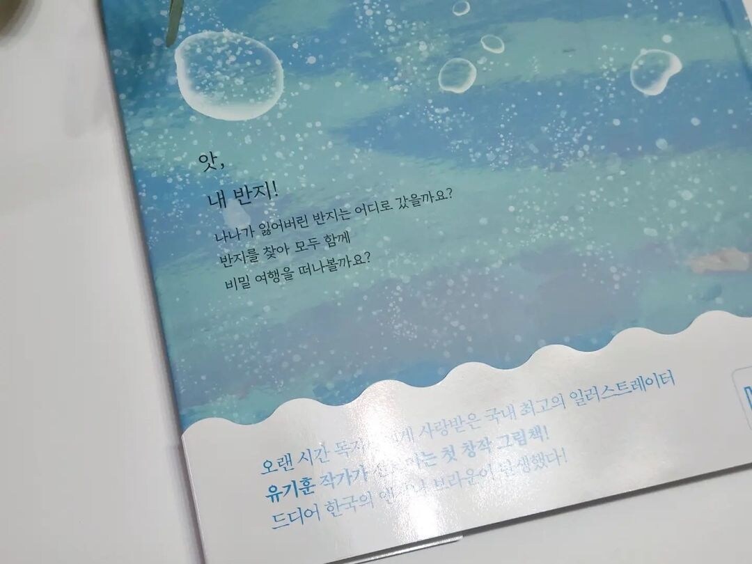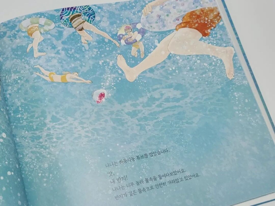 ( 글 / 그림 유기훈 ) 🏖 눈부시게 푸른 바다 하얗게 거품이 부서지는 파도 끝도 없이 펼쳐진 모래사장까지 여름의 바다는 한없이 평화롭습니다. 섬세하게 표현된 바다 그림 속으로 지금 당장 나나처럼 튜브를 들고 신나게 뛰어들어 가고 싶은 마음이 드네요. 마치 선명한 실사처럼 표현된 바다와 하늘, 그리고 바닷속 세상까지 입을 떡 벌리고 감탄하며 보게 되는 생생하고 아름다운 그림책이에요. 특히 바닷속 묘사는 정말 감탄을 자아냅니다. 바닷속에서 바라본 아이들의 동동 뜬 모습, 동글동글 귀여운 물방울이 가득한 넓디넓은 바다. 그리고 그 속에서 유영하는 멋진 물고기떼들!🐠🐟 때론 바다 동굴의 캄캄한 모습도 해파리가 나타나 영롱히 빛나는 모습도 너무 실감나고 생생히 묘사되고 있답니다. 얼마전, 아이들과 어느 늦은 여름 오후, 서해바다를 찾아갔던 추억도 떠오릅니다. 아이도 이 책을 보며 같은 생각을 떠올렸을까요? - 📖 나나는 할머니방에서 루비 반지를 찾아내요. 반지를 끼고 나간 나나는 바다에서 헤엄을 치다 그만 반지를 바닷속으로 빠뜨리고 말아요. 그리곤 그 반지는 작은 물고기에게 전해집니다. 마침 반지가 작은 물고기 몸통에 끼어버리고 반지와 물고기는 한 몸이 된 채 바닷속을 여행합니다. 아기 물고기에게 반지는 너무나 위험했지만 반지 덕분에 신기한 일들을 겪어나가지요. 반지 때문에 불편해했던 물고기이지만, 반지 덕분에 행운으로 가득 찬 일이 생기기도 해요. 말 그대로 물고기와 반지는 험난한 여정을 겪어요. 나나에게 너무 소중한 반지, 반지가 다사 나나에게 돌아갈까요? 물고기 몸통에 낀 반지는 빠질 수 있을까요? 물고기와 반지는 어떤 모험을 함께 했을까요? 그림책 한가득 아름답게 펼쳐진 바다.🌊 마치 바닷물이 한가득 쏟아질듯한 책을 펼치고 바다를 한껏 느껴보는 시간을 가져보세요. 🌿위 리뷰는 도서를 제공받아 읽고, 직접 솔직하게 작성하였습니다.