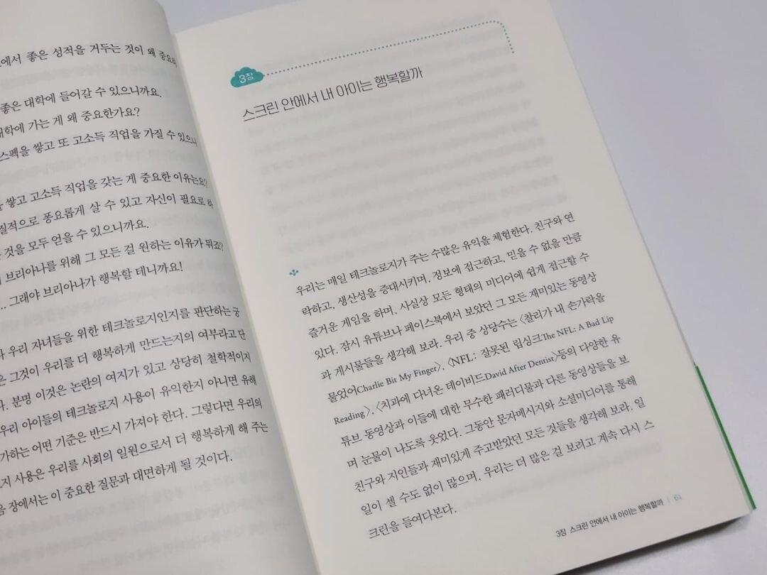 우리 아이들에게 언제 스마트폰을 사줄지, 스크린 타임은 얼마나 허용하는 것이 적절한지, 통제를 어떻게 할지, 하는 것이 옳은 일인지, 과연 테크놀로지로 인해 얻어지는 장점은 무엇인지, 그로 인해 초래되는 단점은 무엇인지 우리는 지금 궁금하다.