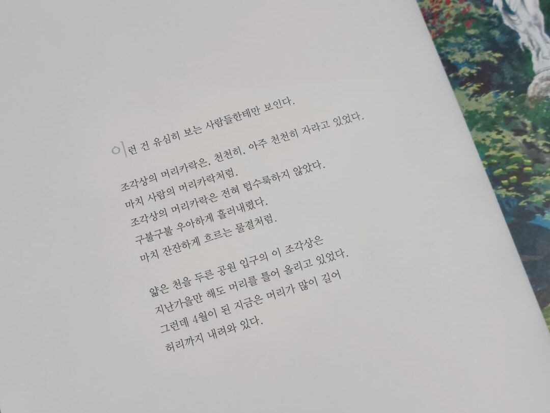 소녀가 본 조각상들은 어쩌면 정말 머리가 길었을 수도 있어요. 혹은 소녀의 상상과 믿음에서 비롯된 것일 수도 있지요. 혹은 세월과 시간의 흔적이 묻었을 수도 있습니다. 나무도 꽃도, 지나던 사람들도 변화할만큼 긴 시간이 흘렀으니 소녀에겐 그렇게 느껴졌을 수도 있지요. 가끔은 혹시 그런게 아닐까 하는 믿음과 기대가 나의 상상력에 날개를 달아주기도 하니까요.