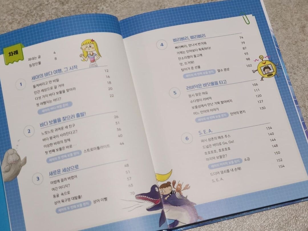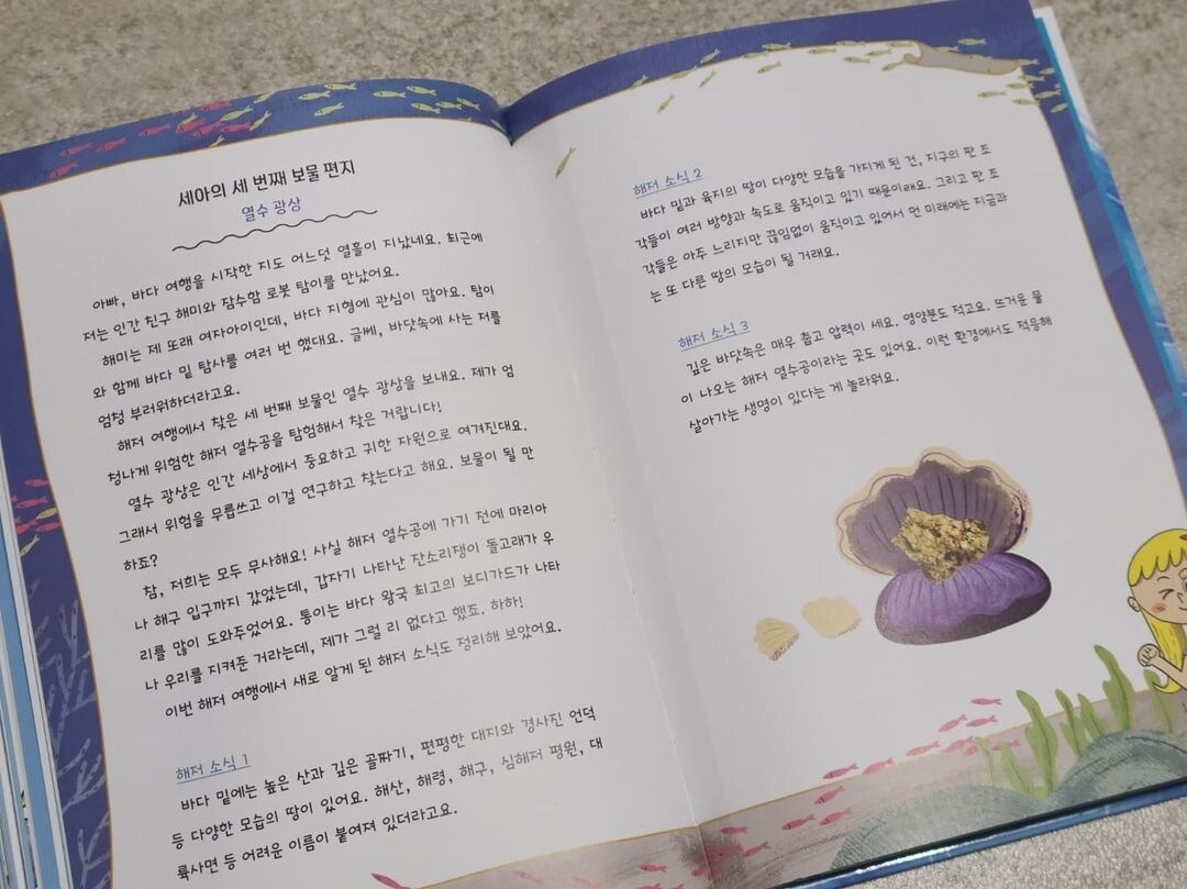세아는 바닷속에서 잠수함 로봇 탐을 보낸 해미와도 이야기를 나누게 되고, 해저 지형들을 찾아 심해 깊은 곳들을 다니며 탐험을 하기도 하고요. 바다 해류를 따라다니는 러버덕을 만나고 쓰레기 섬을 찾기도 하고, 해류에 대해 알게 되지요. 우연히 퍼시 삼촌을 만나 먼 인도양과 대서양까지도 여행을 하고 바닷물에 대한 정보를 배우기도 했답니다.