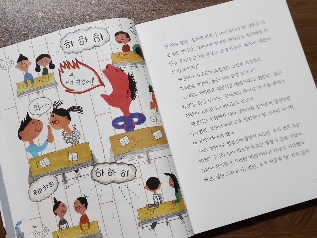 엄청난 추리력으로 교실에서 방귀를 뀐 범인도 척척 찾아내는 채빈이는 꼭 탐정 같았어요. 채빈이는 성빈이와 주인공 현빈이까지 끌어모아 탐정단을 꾸렸죠. 이름에 모두 '빈'자가 들어가는지라 탐정단의 이름은 '빈 탐정단'이 되었어요.
