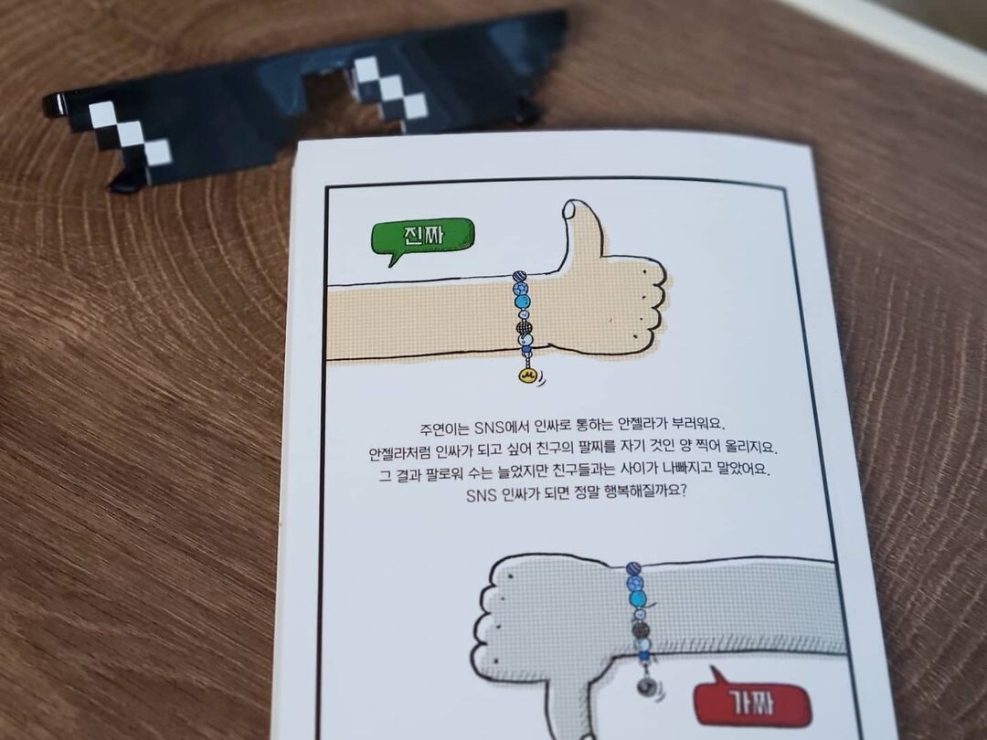 SNS는 장점도 단점도 있답니다. 좋은 점을 잘 활용한다면, 재미도 느끼고 소통을 통해 많은 것을 배울 수도 있고 같은 것을 좋아하는 사람들도 만날 수 있지요. 하지만 그 정도를 지나쳐 과몰입하여 내 진짜 모습 대신 거짓된 모습에만 집중한다면, 진짜 나를 잃어버릴지도 몰라요. 만들어진 가짜 나는 진짜가 될 수 없거든요. 가짜의 나를 만드느라, 진짜 나를 잃어가는 일은 있어서는 안되겠지요. 진짜 행복은 가짜의 나로는 절대로 만들 수 없으며, 진짜 내가 스스로 만들어가야 한다는 것을 꼭 명심하며 살아가야겠습니다.