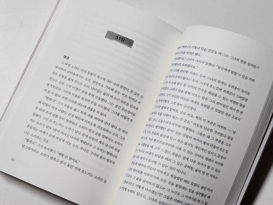 마크가 헬레나의 어깨를 만져도 헬레나는 피하지 않았다. 그리고 이 책... 이 책이 뭔지는 몰라도... 헬레나는 마크에게만 이야기하고 있다. 어쩌면 그들의 관계가 그렇게 빨리 진전된 것이 그 책 때문인지 모른다. 두 예술적 영혼 사이의 무언가일 수도 있다. 글 쓰는 작업이 서로를 결속해 주는 것이다. (P.286)
