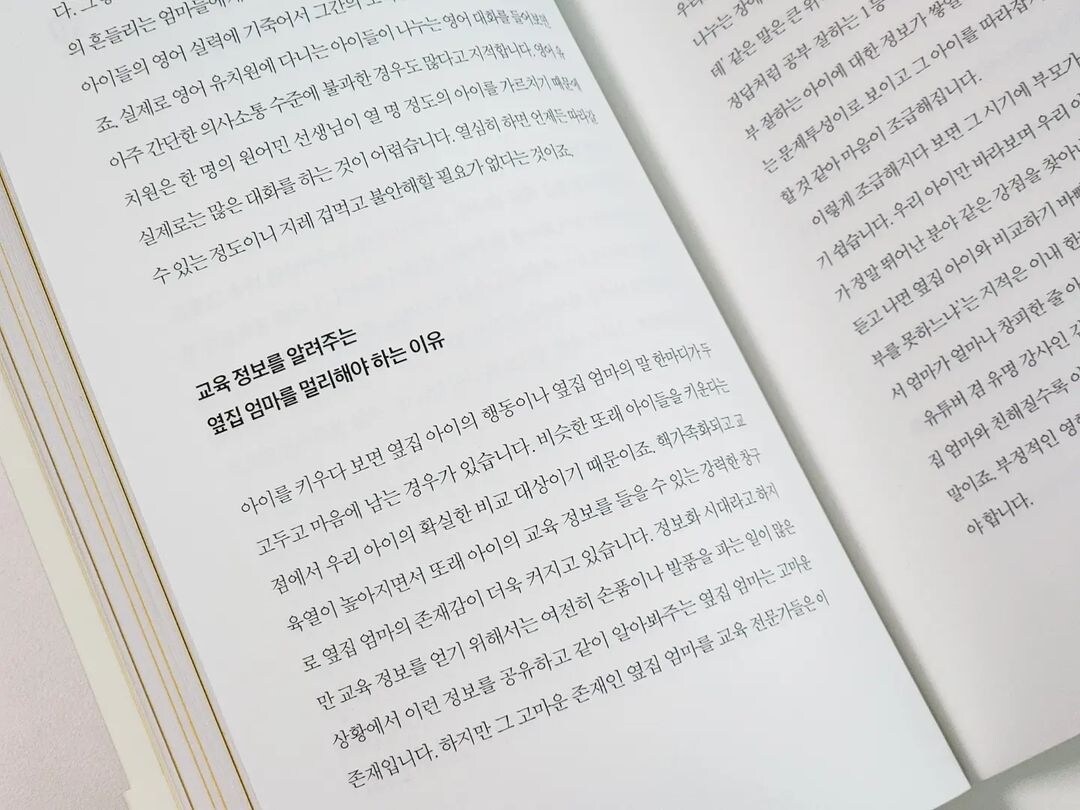 교육정보를 알려주는 옆집 엄마를 멀리해야 하는 이유도 공감되었다. 정보를 공유하고 같이 알아봐 주는 옆집 엄마는 비교를 강화하고 마음을 조급하게 하며, 결국 우리 아이의 장점을 찾아내지 못하게 한다.