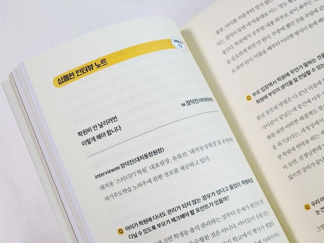 소아정신과 교수, 정신의학과 교수, 학원 전문가, 초등 교사, 메타인지 전문가, 학부모와의 인터뷰 노트도 도움이 되었다. 특히 학부모다 보니 학원에 아이를 보낸 후 불안함을 가지기 쉬운 부모들에게 부모가 체크해야 할 부분과 놓치기 쉬운 부분을 알려주는 느낌이었고 교육 관련 전문가들의 이야기라 좋았다.