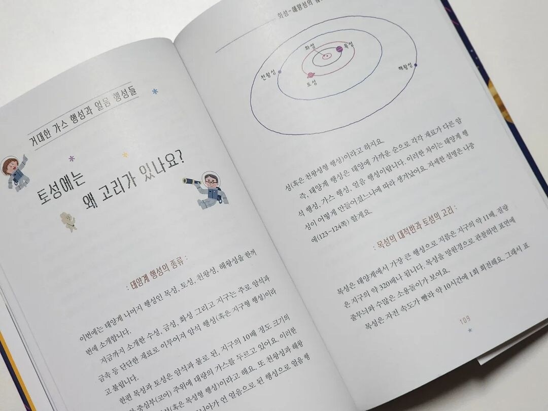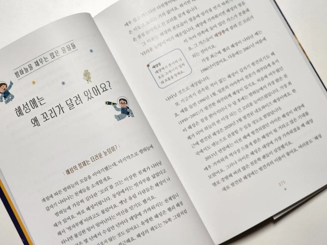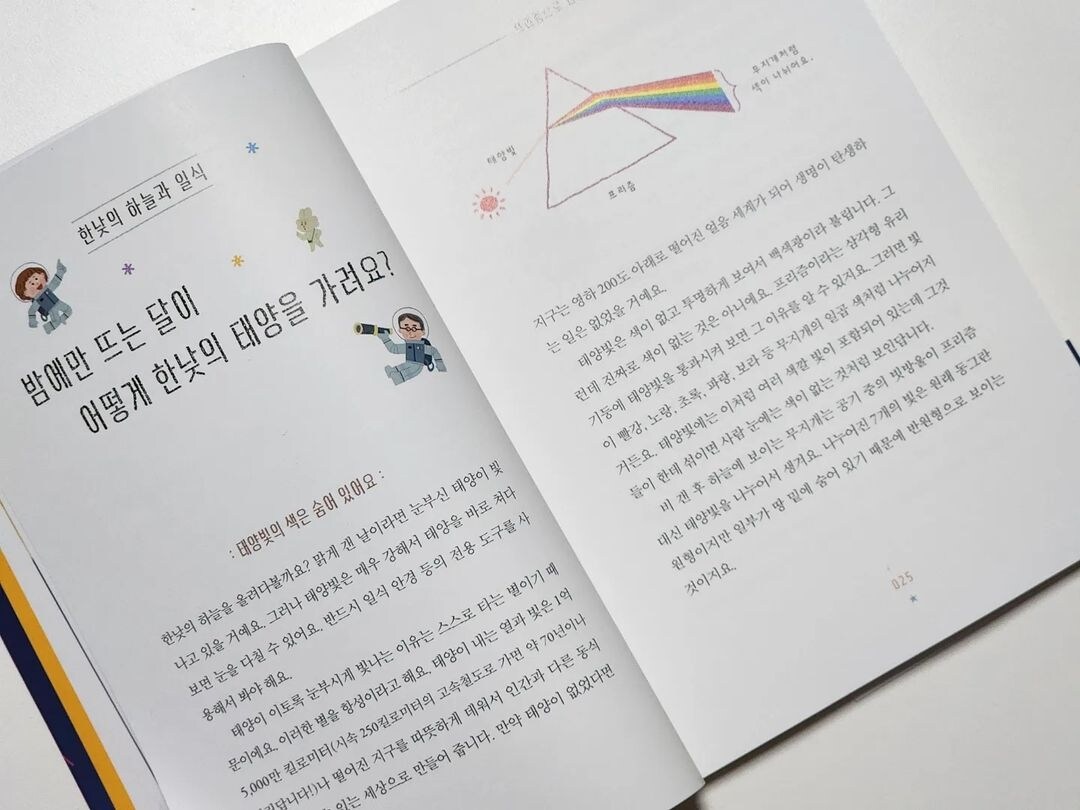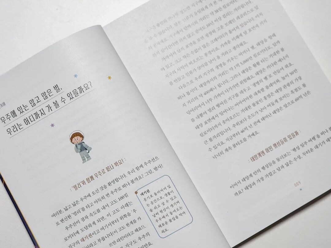 궁금하지만 이유를 몰랐던 다양한 우주에 관한 질문들, 대충 들어 알고있던 얕은 지식들에 대해 초등 어린이들의 눈높이에 맞는 설명으로 하나하나 풀어내는 책. 정말 우주에 관한 아이들의 호기심을 충족시켜주기에 매우 충분하다. "내가 궁금했던 질문 여기 다 있네!" 할 만큼 많은 정보가 담긴 책이다. 초등학생이라면 꼭 알아야 하는 우주 지식을 가득 담은 느낌이다.