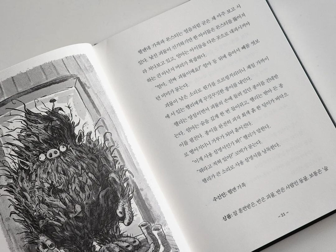 핼리는 도서관에서 80년전  루나 칼리라는 사람이 쓴, 몬스터 사전 [몬스터 : 관찰을 통해 알게 된 몬스터의 특징과 습관]을 빌려와요. 너무 낯선 몬스터 내니에 대해 조금씩 이 책을 통해 알아가게 되지요. 몬스터 내니 사용 설명서에는 없는 몬스터 책의 내용들을 하나둘 익혀가며 삼 남매는 몬스터 내니를 숲에서 실컷 뒹굴게도 하고, 자신들만의 소통법으로 조금씩 몬스터 내니, 아니 '그라'와 교감하기 시작합니다. 그리곤 그라가 삼 남매의 집으로 오게 된 이유를 알아보려 하지요.