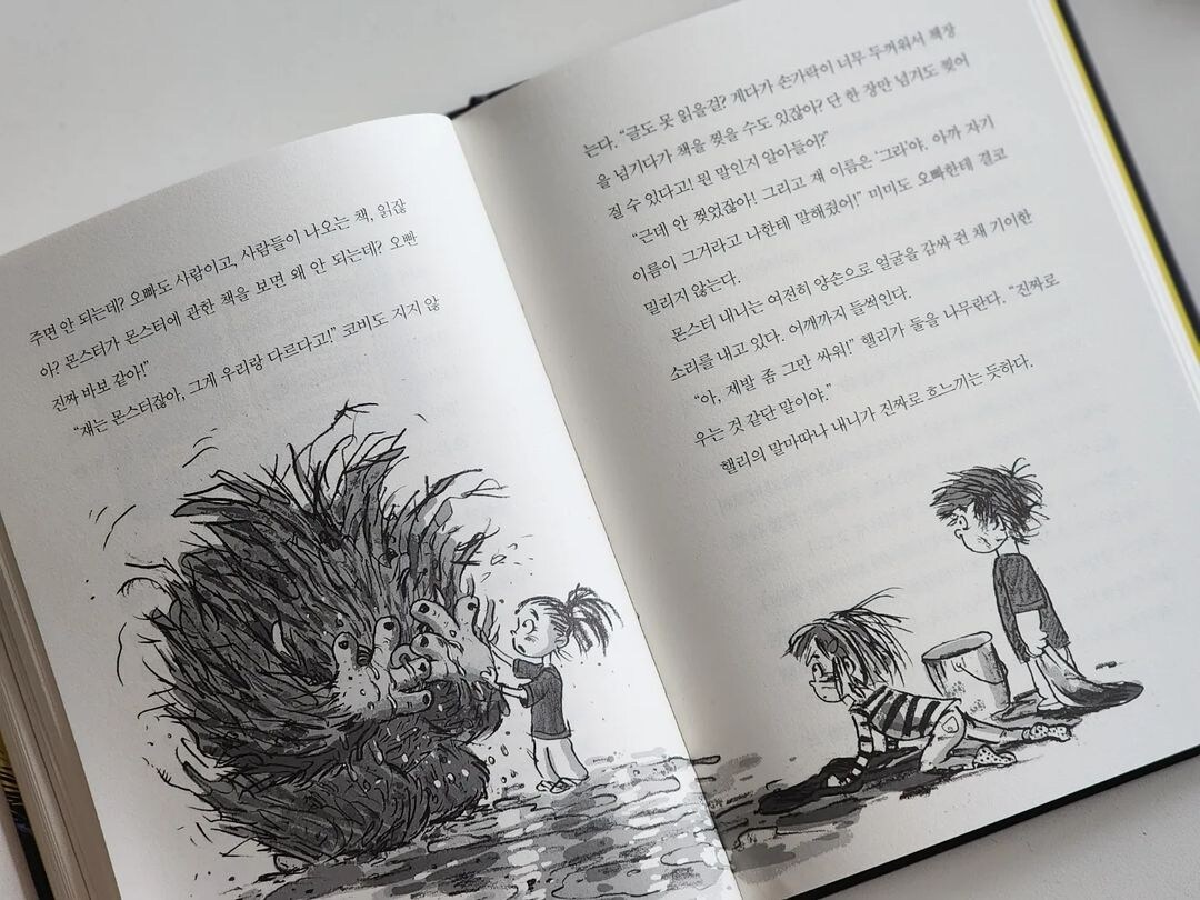 이 책 몬스터 내니 1,2권은 특히 아이가 잠깐씩  시간이 날 때마다 바로 집어 들고 읽었을 만큼, 아주 재미있게 집중해서 읽었던 책이랍니다. 마침 등장하는 주인공 남매들이 저희 집처럼 누나-남동생-여동생 구성의 삼 남매여서일까요? 마침 책 속 셋째인 미미가 똘망하고 엉뚱 발랄하면서도 상상력이 풍부한 아이여서 그런 건지 본인처럼 셋째여서 그런 건지, 미미에게 무척 공감도 되고 멋진 아이였다며 정말 재미있었다고 하더라고요.