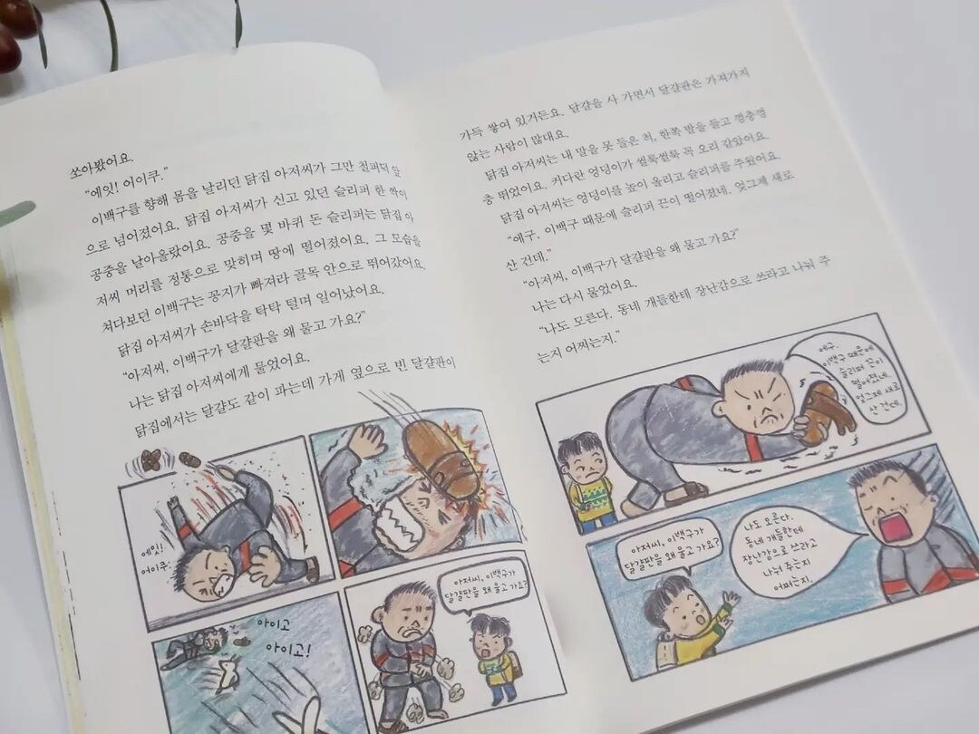 닭집 아저씨는 자꾸 철물점네 개 이백구에게 화를 내요. 달걀판을 자꾸 물어간다며 말이에요. 괜히 화를 내다 슬리퍼도 끊어졌답니다. 그런 아저씨가 이해 가지 않고, "너 공부도 못하지."라고 비꼬는 아저씨의 말에 화가 나 실랑이를 하느라 대박이는 학교도 지각하고 말지요. 성민이 아빠인 아저씨 때문에 괜히 성민이도 얄미워졌어요.