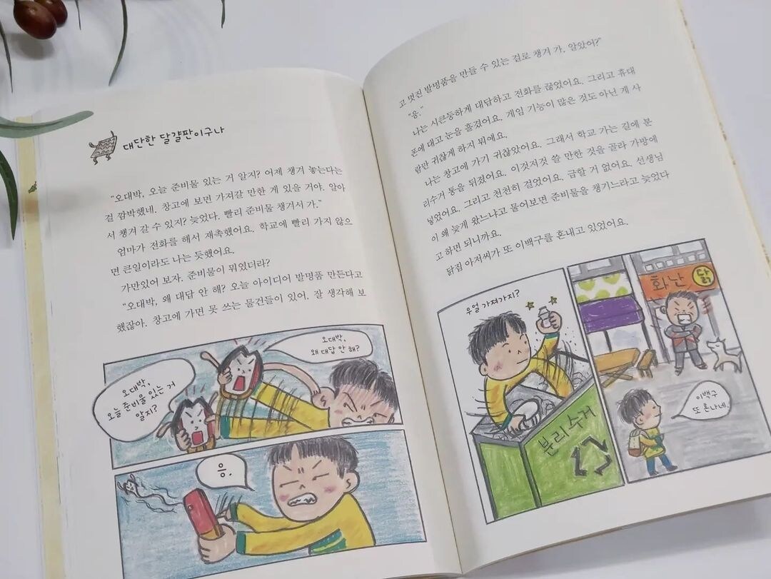 그러던 어느 날, 아이디어 발명품 대회가 열리게 된 학교. 분리수거 통을 뒤져 쓸만한 것을 고른 대박이는 끊어진 닭집 아저씨의 슬리퍼까지 들고 등교했어요. 그리곤 댤걀판을 잔뜩 가지고 온 성민이와 한 팀이 되어 얼떨결에 함께 발명품을 만들게 되었답니다.