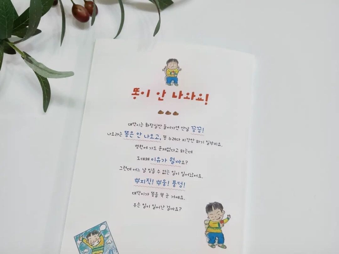 만날 듣는 엄마 잔소리가 제일 싫은 오대박! 대박이는 똥누느라 매일이 전쟁이에요. 출근길마다 엄마는 대박이에게 잔소리 폭탄입니다. "콩 골라내지 말고 다 먹고, 밥도 많이 먹고, 나물도 먹고, 화장실에 오래 앉아 있지 말고......." 하지만 대박이는 엄마가 급하게 출근하고 나자, 잔소리는 멀리 날려버리고, 조금만 담은 밥을 들고 느긋하게 먹고는 학교에 갑니다.