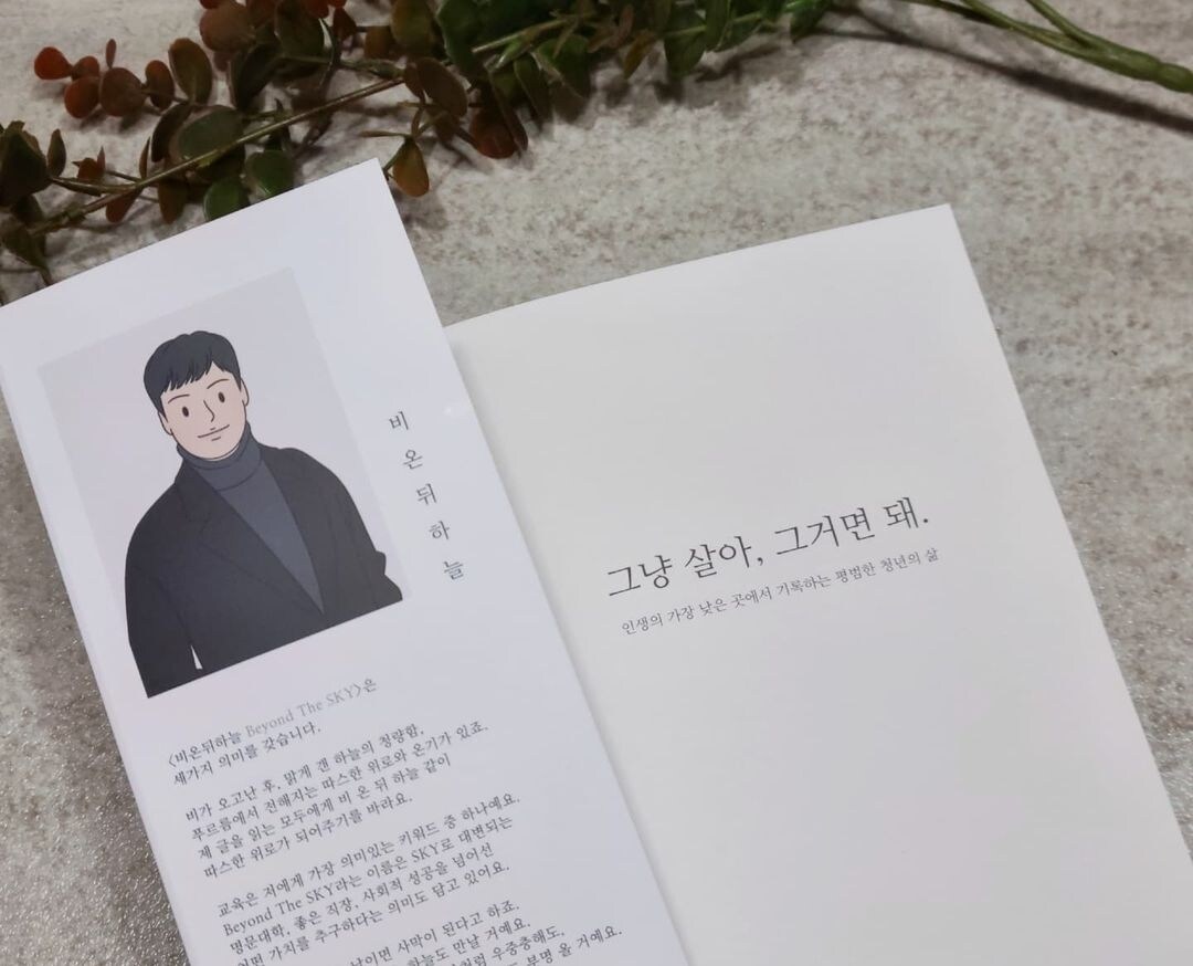 #비온뒤하늘 어쩌면 이 책의 내용은 작가의 필명으로 요약할 수 있을 것 같다. 비온 뒤 하늘은 더없이 푸르고 잔잔하며 고요하다. 전쟁 같은 폭풍과 뿌연 구름이 사라지면 더없이 평화롭다. 이제 전쟁 같은 비구름은 갔다. 작가의 앞날에 잔잔한 하늘이 항상 함께 하기를, 그 평화로움이 앞으로 늘 함께 하기를 진심으로 바란다.