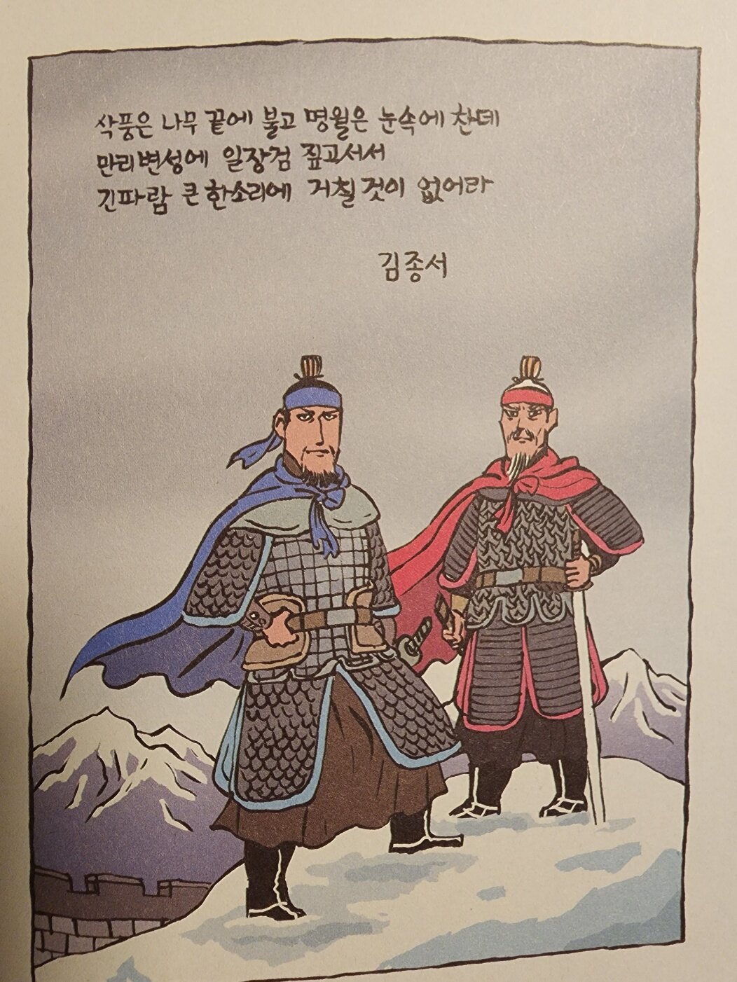 삭풍은 나무 끝에 불고 명월은 눈속에 찬데만리변성에 일장검 짚고 서서긴파람 큰 한소리에 거칠 것이 없어라김종서 - P87