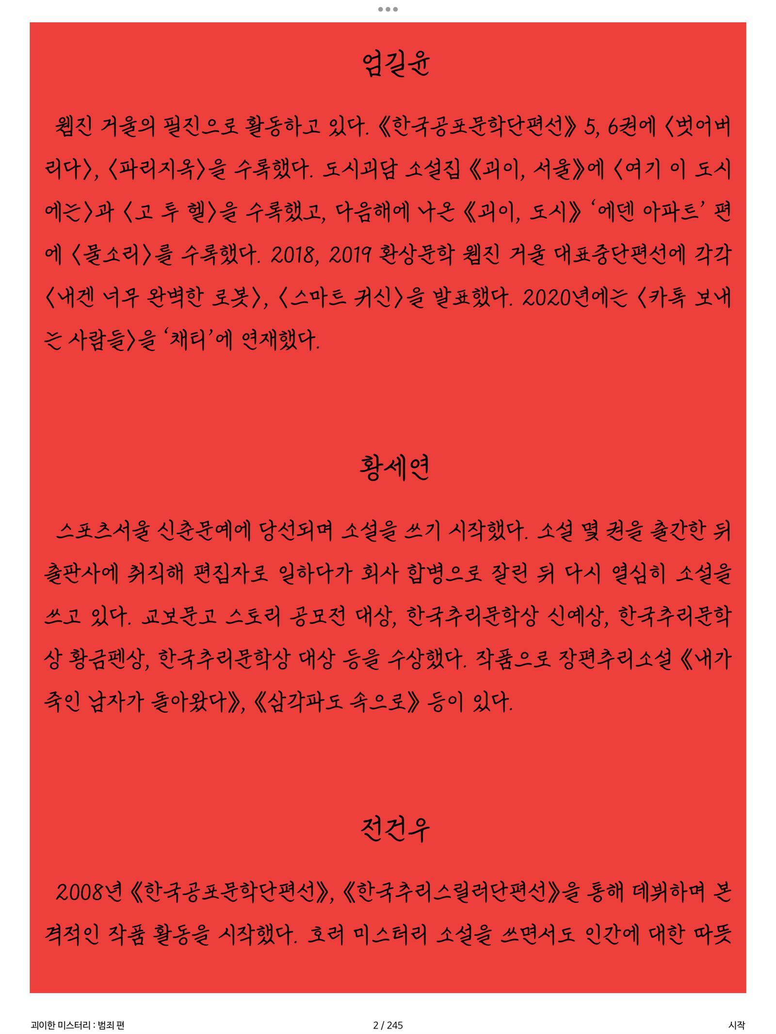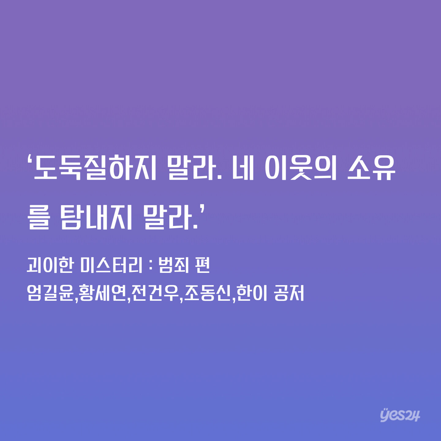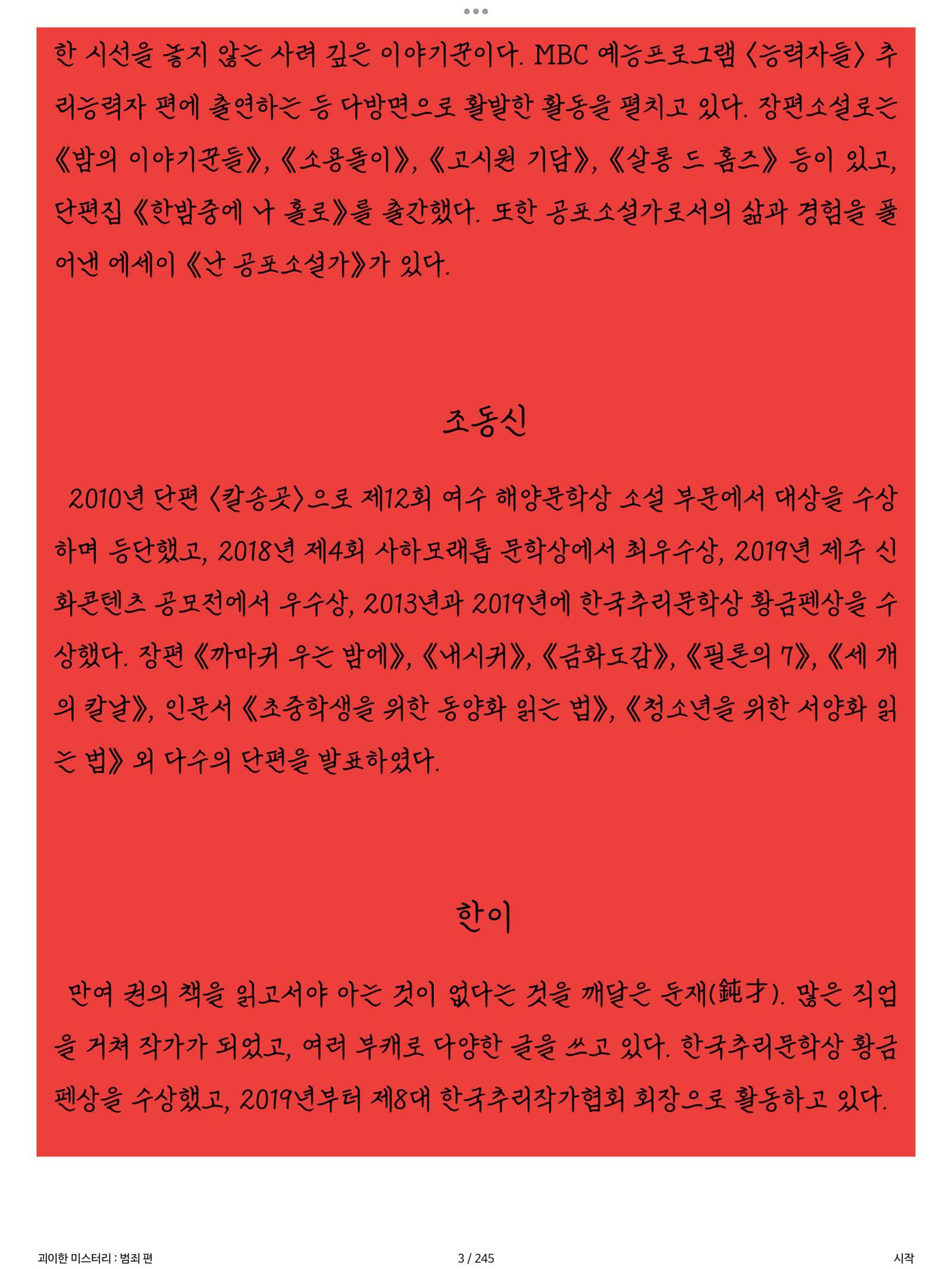 대부분의 추리, 호러 작가들이 가장 잘하는 일이 무엇인지 아십니까? 당신의 가장 약한 부분을 공격하는 것입니다. 가장 일어나지 않았으면 하는 일, 절대 배신하지 않았으면 하는 믿음, 무슨 일이 있어도 실제로 맞닥뜨리고 싶지 않은 그것을 당신의 견고한 현실 속에 슬그머니 밀어넣는 겁니다.