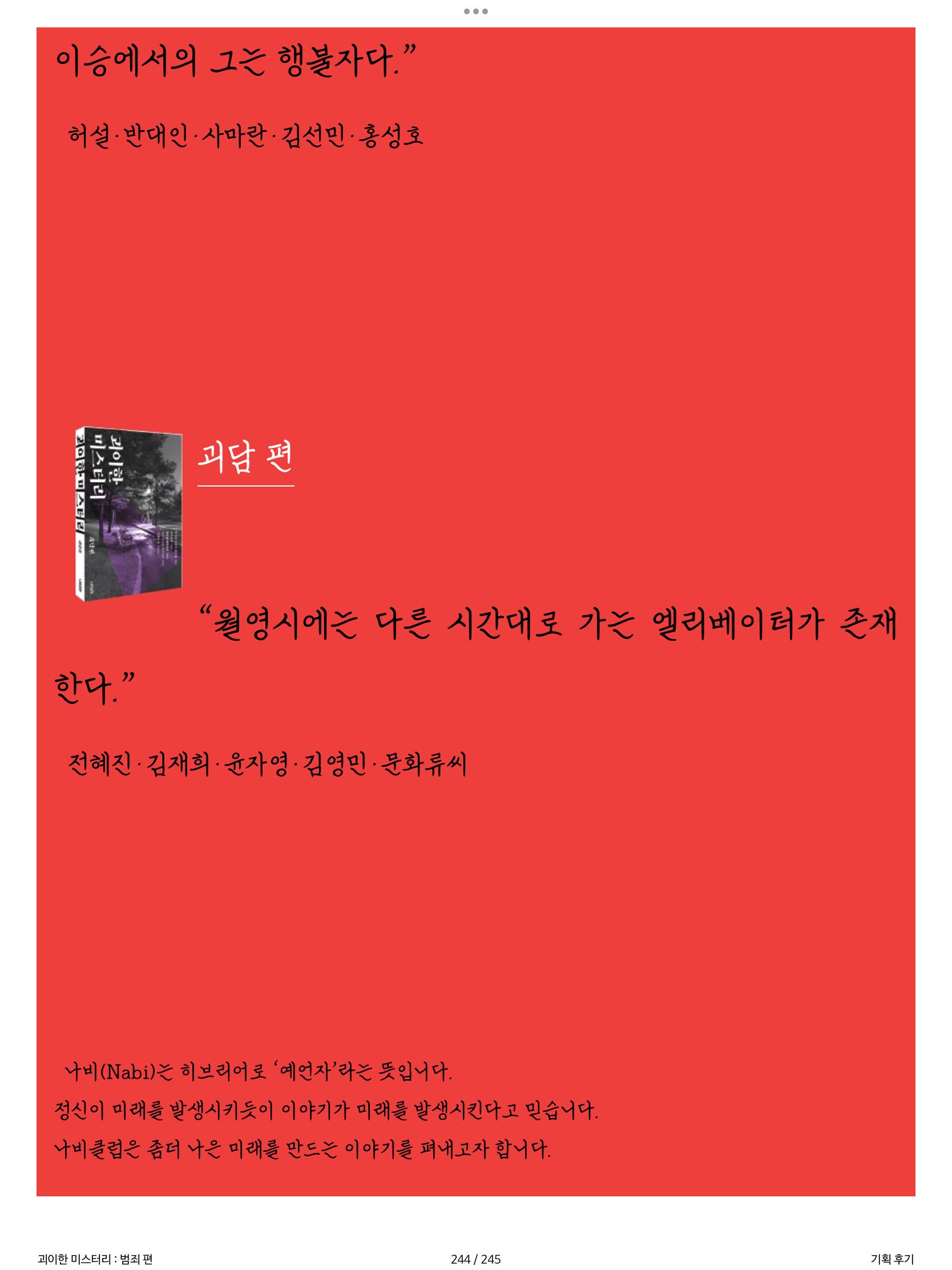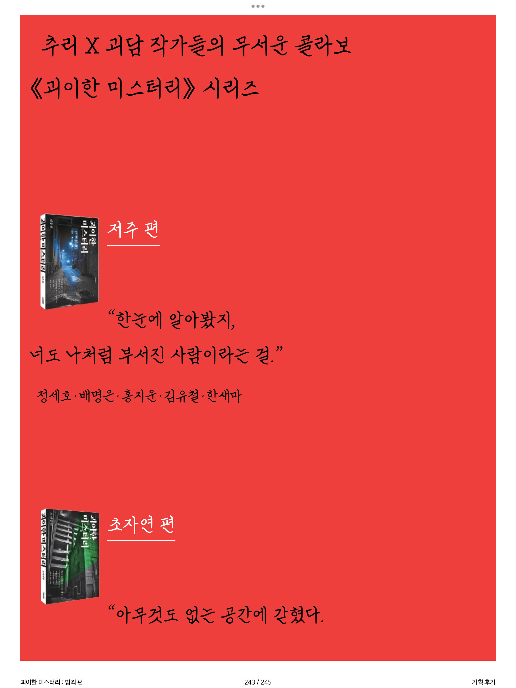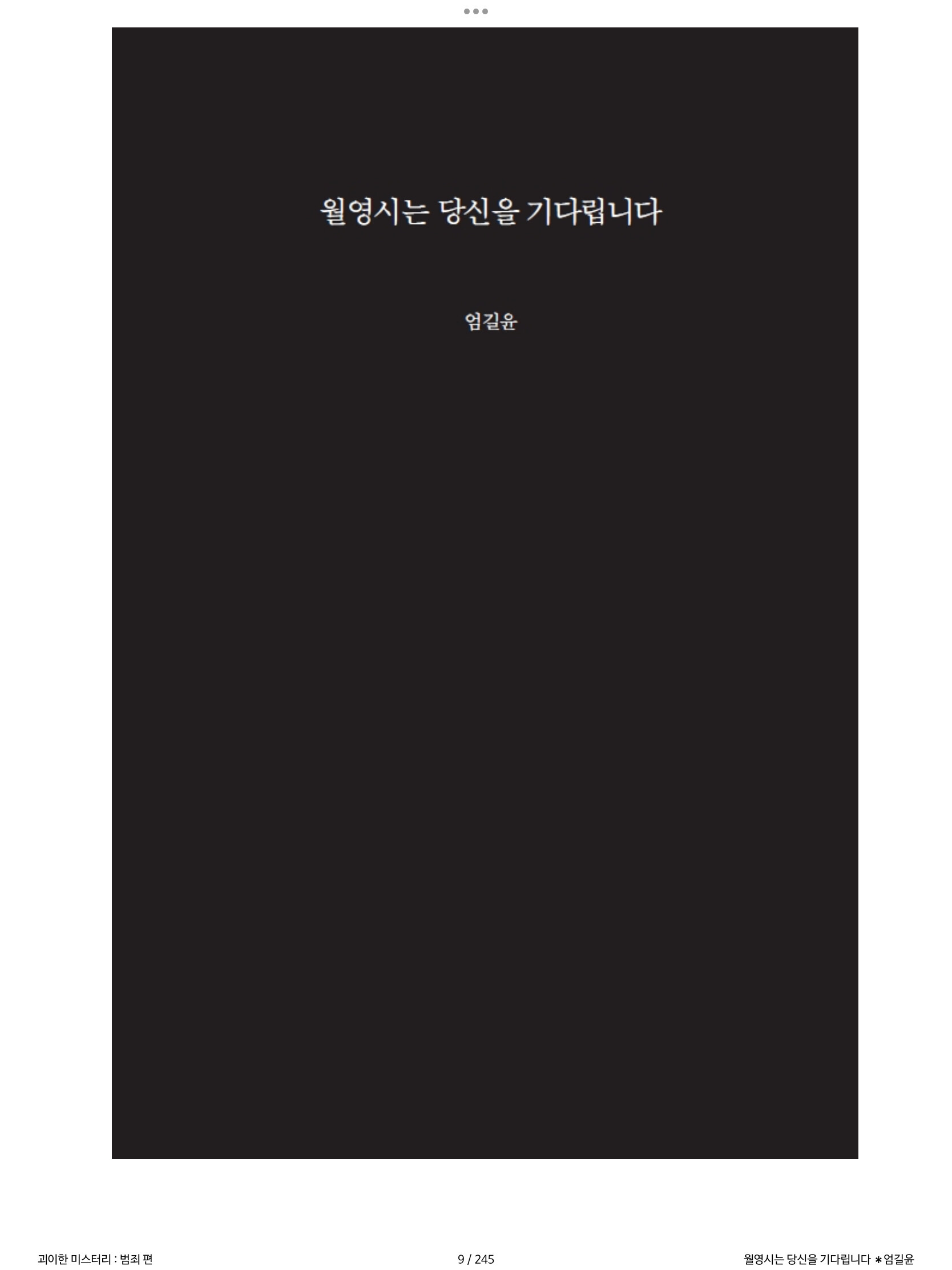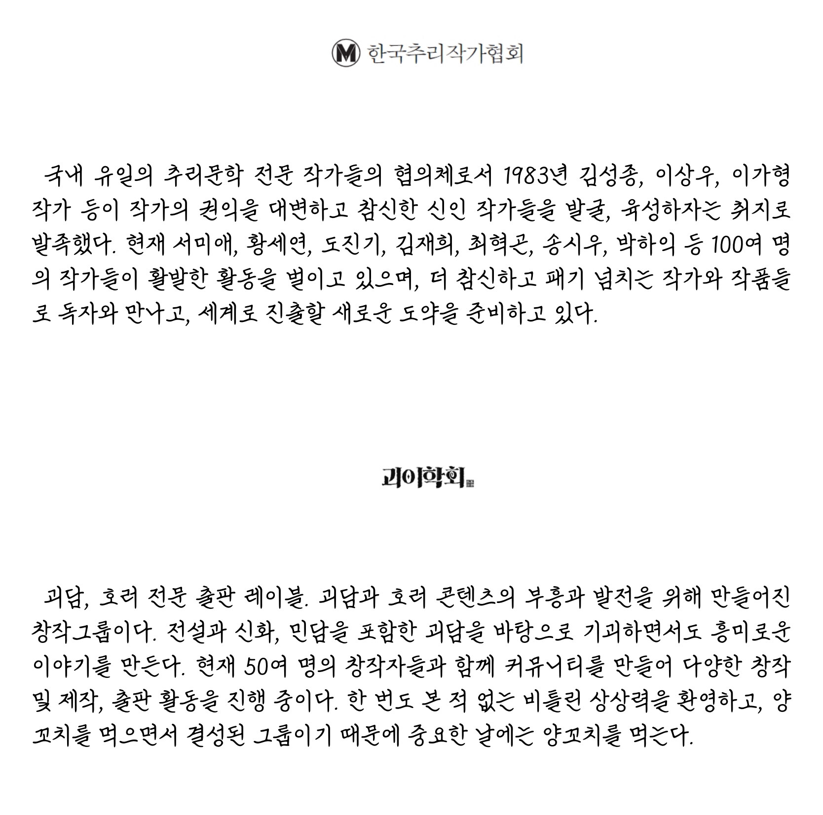 만약 인간이 가진 미움과 증오를 눈으로 볼 수 있도록 형상화할 수 있다면 기괴한 일들이 벌어질 것이 분명합니다. 월영시란 그런 것이 가능한 공간입니다. 저주가 단순히 저주로 끝나는 것이 아니라 직접적으로 누군가를 해할 수 있는 힘을 부여하는 도시. 《괴이한 미스터리》 시리즈에서 월영시가 주요한 소재이자 또 하나의 주인공인 이유가 여기에 있습니다.