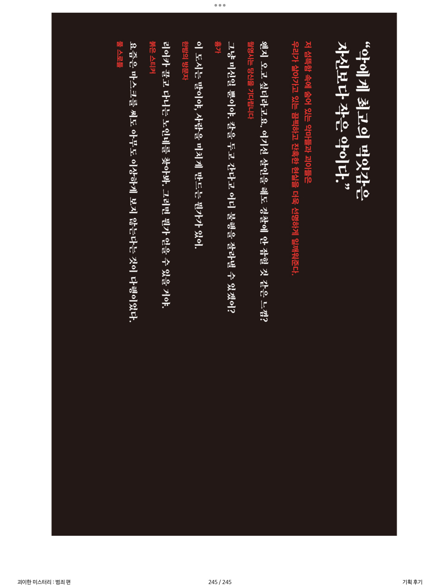 언젠가 독자 여러분들도 ‘순한 맛’ 말고 ‘매운 맛’도 제대로 볼 수 있기를 기대하며, 마지막 반전에서도 부디 눈을 돌리지 말았으면 좋겠습니다. 어쩌면 진정한 디스토피아는 우리의 마음속 정경일지도 모르겠습니다.