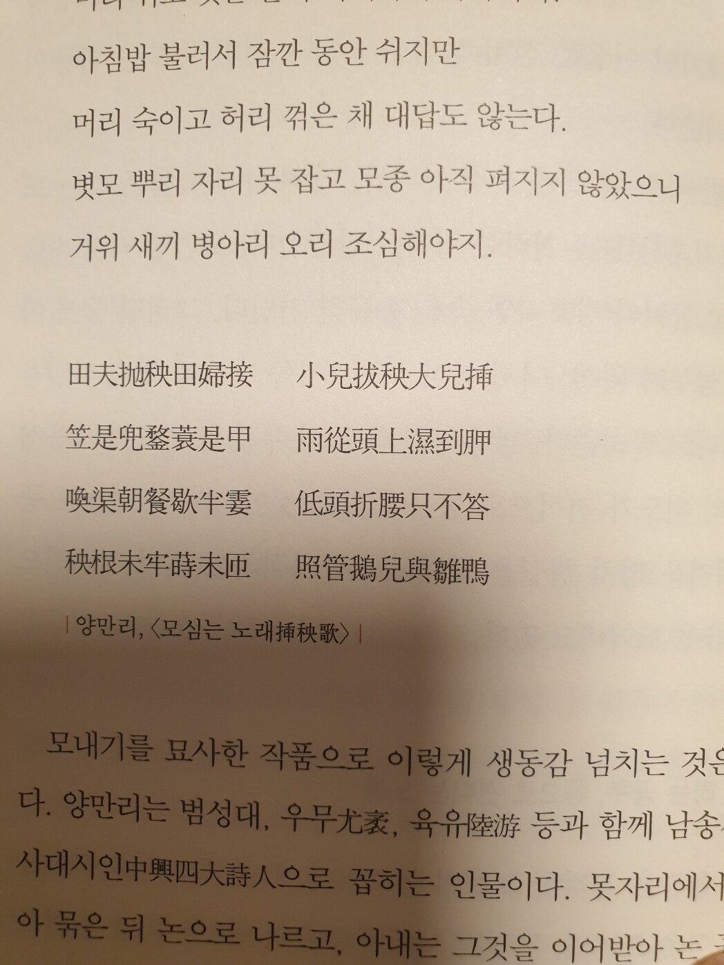 농부가 모 던지면 아낙네 이어받고 어린 아이 모 뽑으면 큰 아이는 모심는다. 삿갓은 투구요 도롱이는 갑옷이라 머리 위로 빗물 흘러 어깨까지 축축하다. 아침밥 불러서 잠깐 동안 쉬지만 머리 숙이고 허리 꺾은 채 대답도 않는다. 볏모 뿌리 자리 못 잡고 모종 아직 펴지지 않았으니 거위 새끼 병아리 오리 조심해야지.