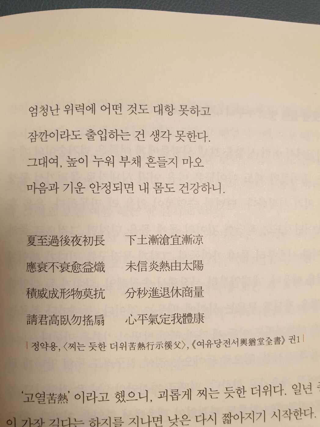하지 지난 뒤에 밤이 비로소 길어지니 땅도 점점 서늘해져 날씨도 서늘해져야 하거늘, 수그러들어야 마땅한데 더더욱 타오르니불같은 이 열기가 해에서 나온다는 걸 못 믿겠구나. - P126
