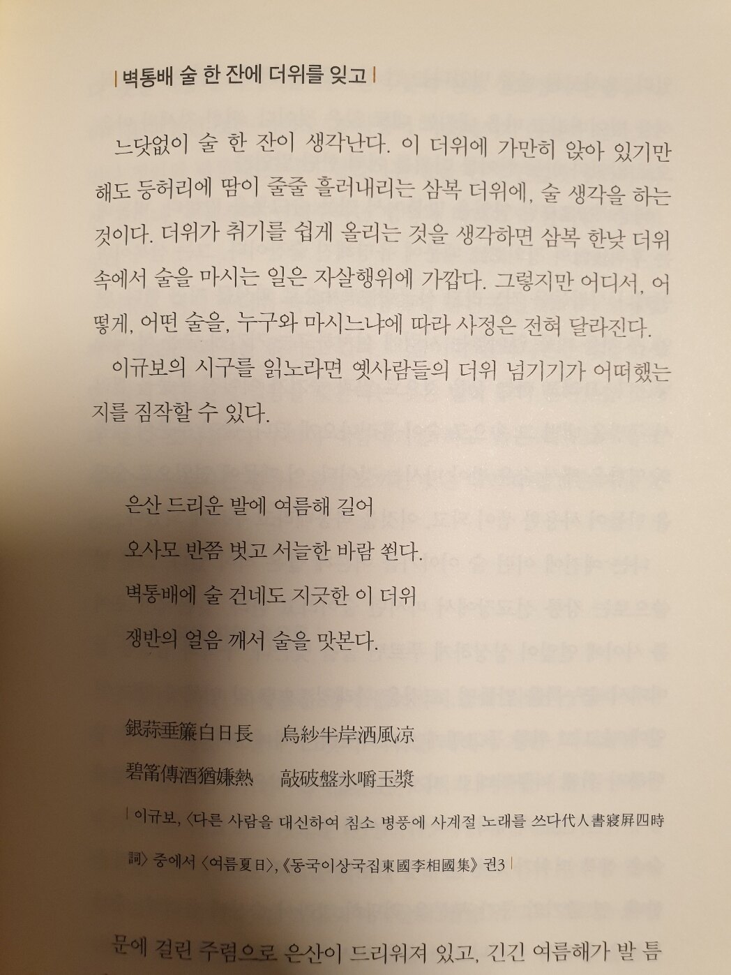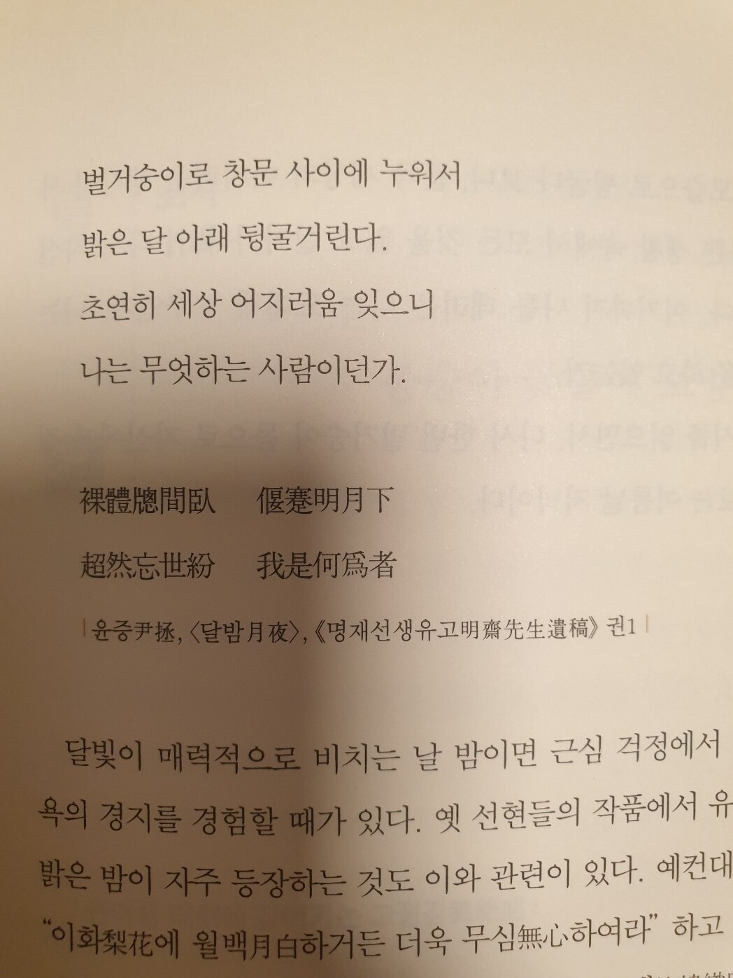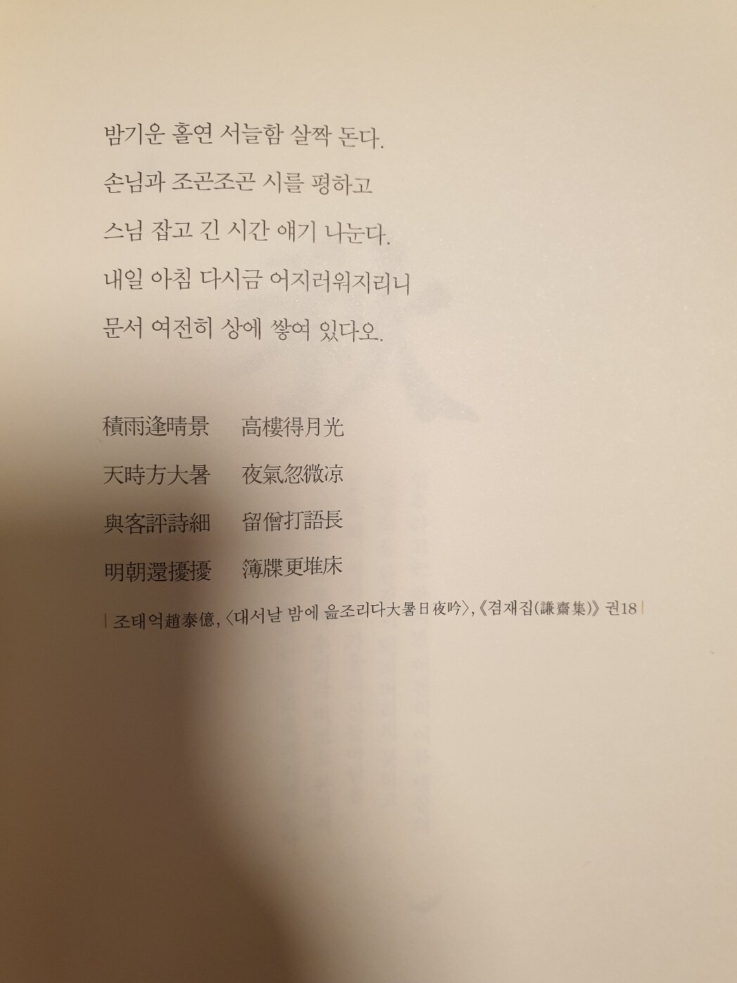 장마에도 맑은 정경 만나 높은 누각에서 달빛 얻었다. 때는 바야흐로 대서인데 밤기운 홀연 서늘함 살짝 돈다. 손님과 조곤조곤 시를 평하고 스님 잡고 긴 시간 얘기 나눈다. 내일 아침 다시금 어지러워지리니 문서 여전히 상에 쌓여 있다오. - P154
