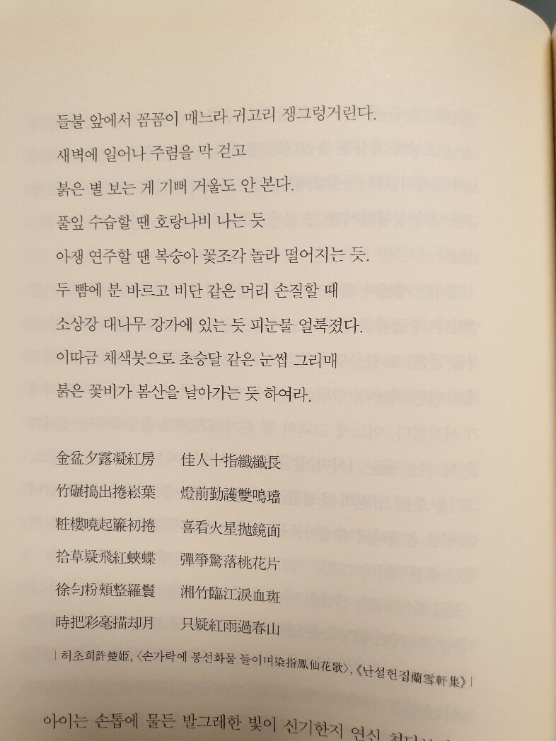 봄이 가면 병든 사람 어쩔 수 없어 문 나설 때는 적고 문 닫을 때 많아라. 두견새는 공연히 화려한 그리움 간직하고아직 꽃 지지 않은 청산에서 울음을 운다.
