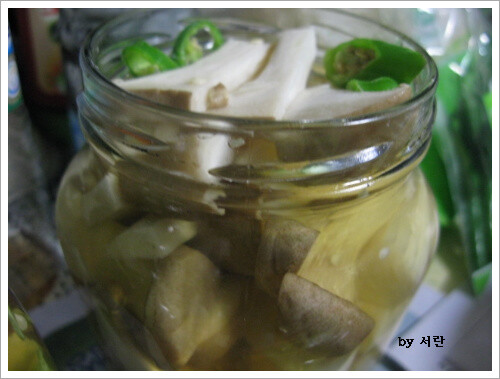 그리고 오이피클을 담기 위해 끓인 식초물을 새송이버섯에도 넣어 주었다.