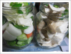 오이피클 재료를 썰어서 모두 담은 후에 새송이버섯도 썰어서 유리병에 넣어 주었다.