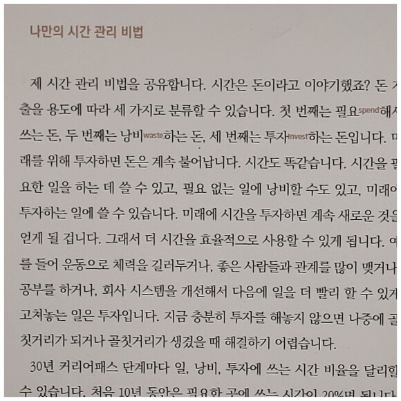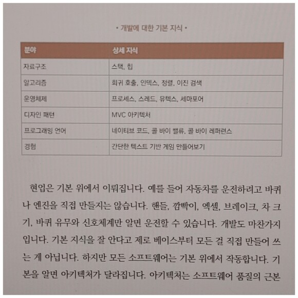 이 책은 저자의 풍부한 경험으로 개발자의 성장에 필요한 부분을 설명합니다. 하스스톤 모바일, 디아블로, 워크래프트 등 익숙한 게임뿐만 아니라 머신러닝·인공지능을 기술을 활용해 기업에게 적합한 광고 서비스를 제공하는 회사인 몰로코를 통해 기업과 분야를 넘나드는 다양한 경험을 책을 통해 얻을 수 있었습니다. 또한 다른 개발서적에서는 볼 수 없었던 시간 관리의 중요성도 소개합니다. 소홀해지기 쉬운 시간 관리에 대한 강조를 하고, 저자의 시간 관리 노하우를 통해 업무를 넘어 인생을 관리하는 법까지 얻을 수 있습니다. 부록인 개발 공부에 대한 고민, 개발 분야의 확장에 대한 고민, 코드 리뷰에 대한 부담감 등 저자의 친절한 답변으로 구성된‘개발자 고민 상담 119’도 유용했습니다.
